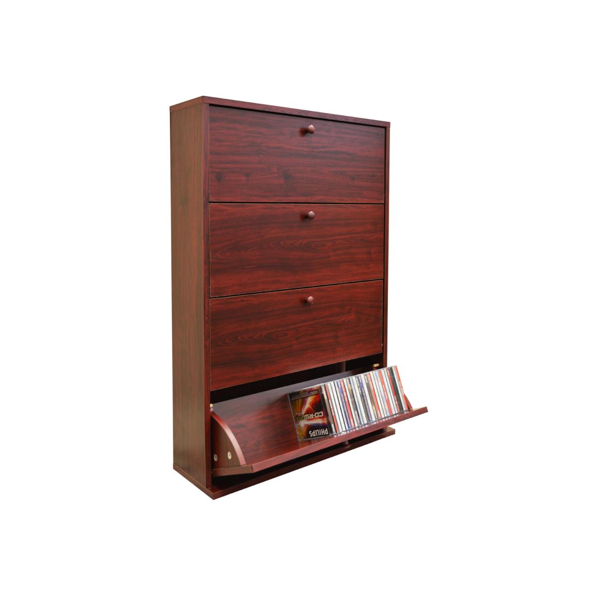 A simply designed mahogany wood effect CD storage unit, featuring tilting open doors and colour matched wood handles. Holds up to 200 CDs - 50 CDs per drawer. Inside Drawer 19h x 53w x 14d cm Display items not included.