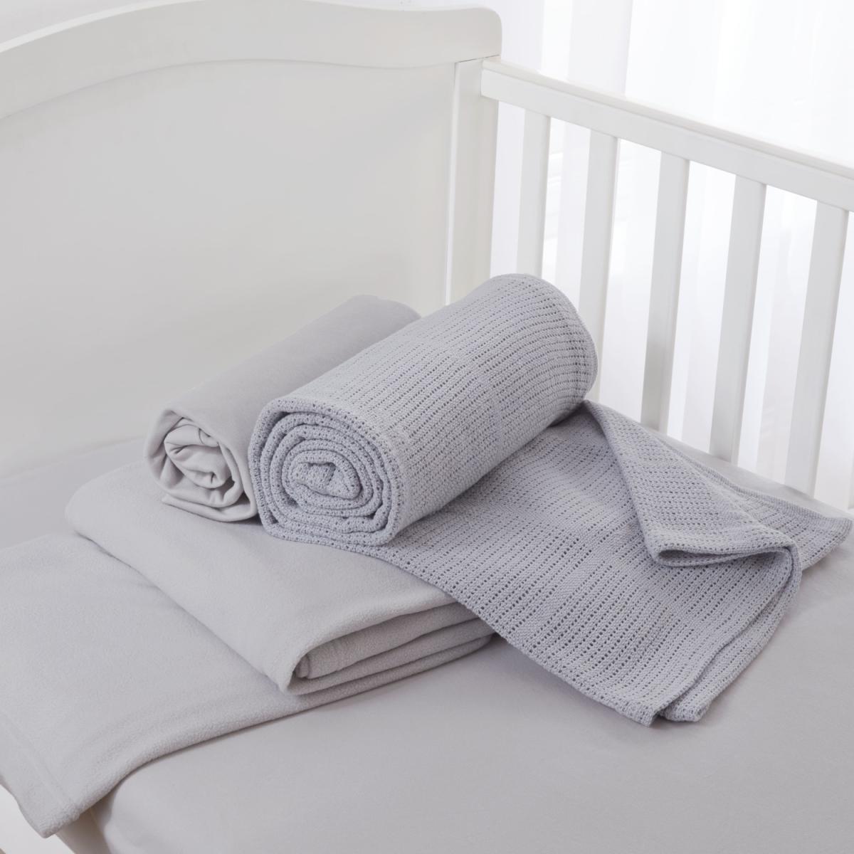 Claire De Lune soft and luxurious Baby Starter Set. Contains 2 Fitted cotton sheets with Micro-Fresh, Cotton Cellular Blanket and Polar Fleece Blanket. Oeko Standard 100 Certified. Clair De Lune soft and luxurious Baby Starter Set. 2 Fitted cotton sheets made from 100 cotton jersey, cot bed size - 67x137cm with Micro-Fresh, 100 Cotton Leno Weave Cellular Blanket size 120x170cm and 100 polyester Polar Fleece Blanket, size 120x160cm. Oeko Standard 100 Certified.