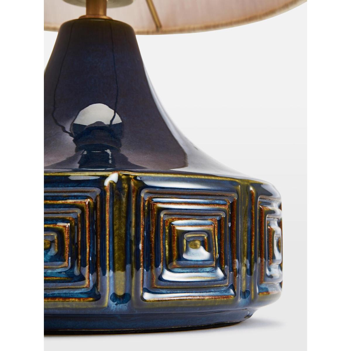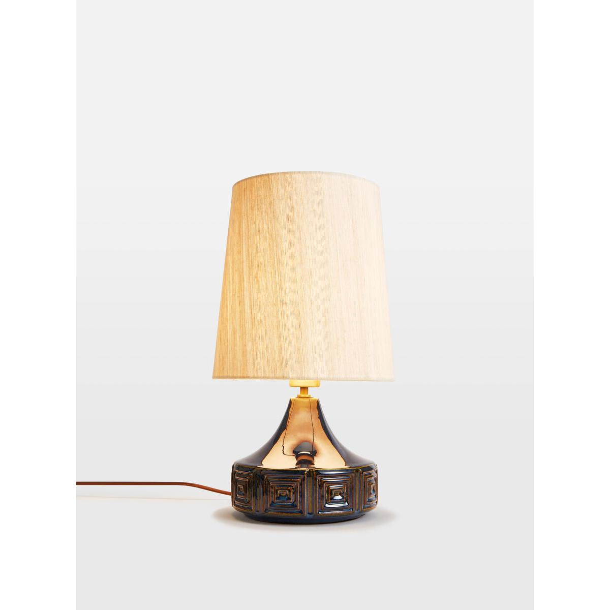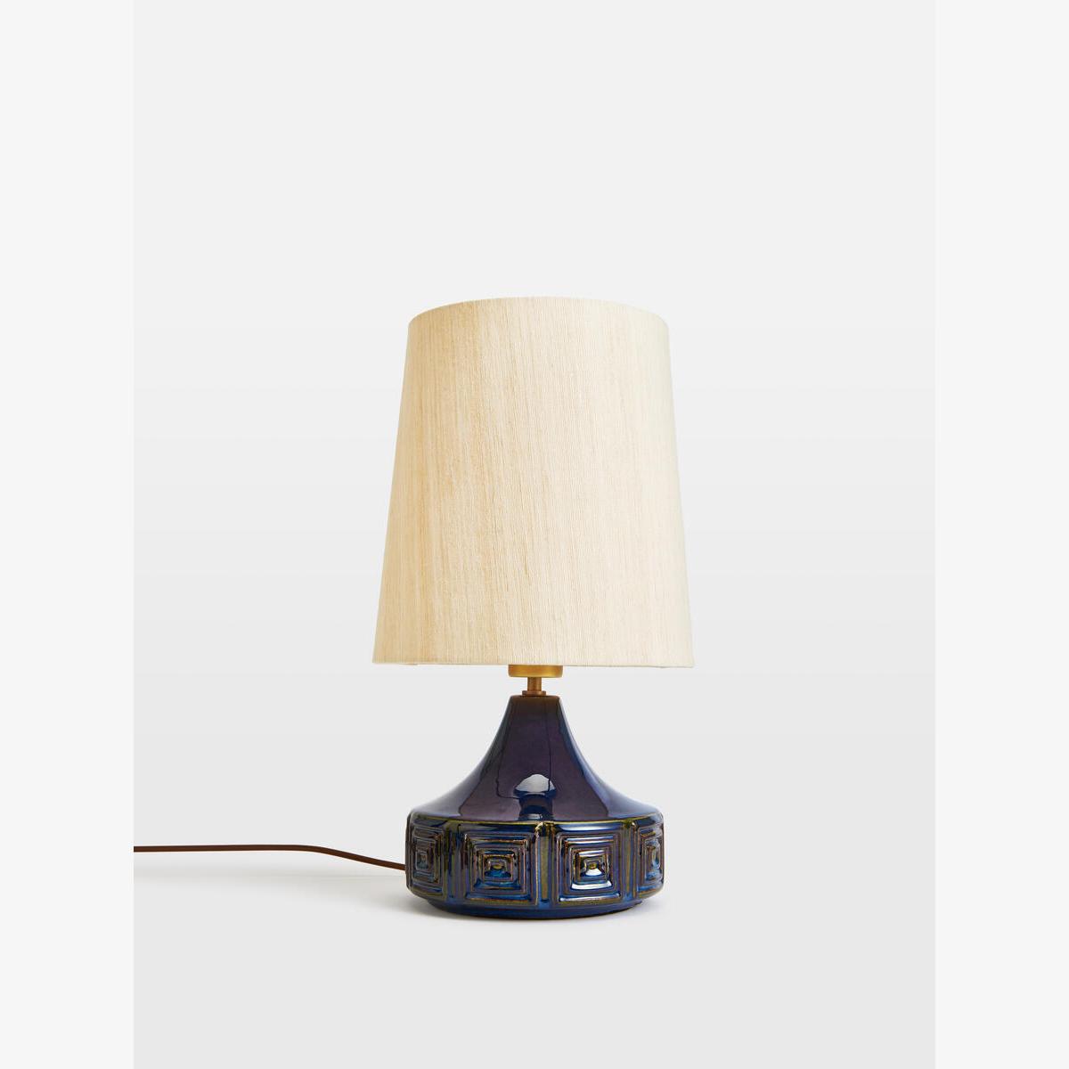 The Cecil Table lamp features a ceramic base with embossed geometric squares as a nod to vintage styles. Spotted in White City House, this small lamp is finished with a reactive glaze and a raw silk linen shade, which has been woven from natural, untreated yarns for subtle texture and elegant sheen. Place atop a console table, or keep it bedside to create an ambience for late-night reading. Vintage style small table lamp Raw silk linen shade woven from untreated yarns Smooth shade with slight sheen Two-tone colour effect base Requires one x E26/ 6W bulb Embossed geometric squares Reactive glazed base Inspired by White City House
