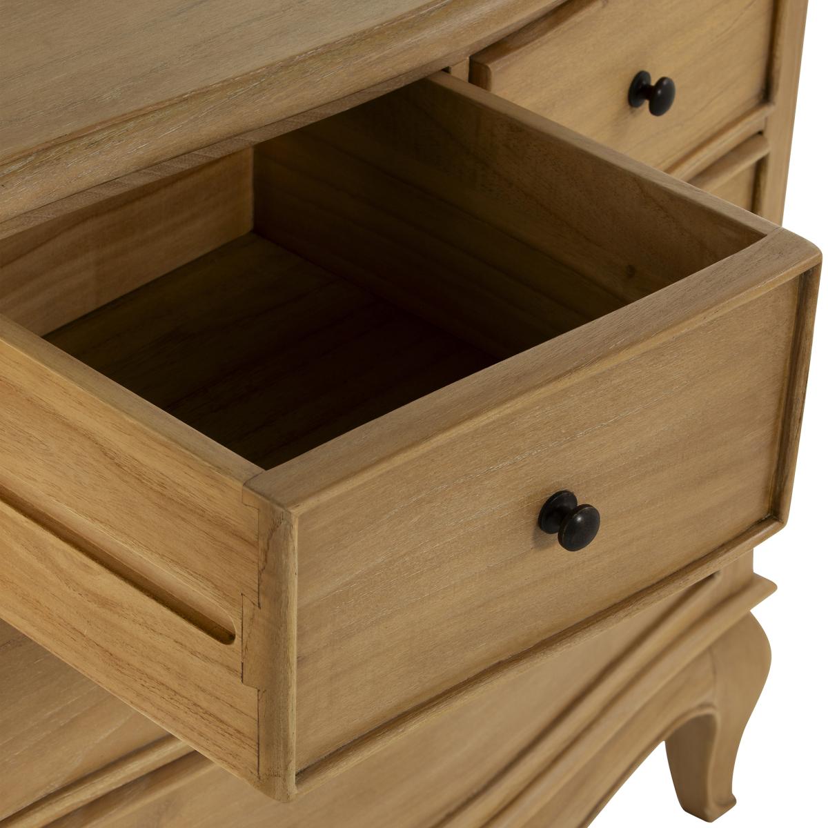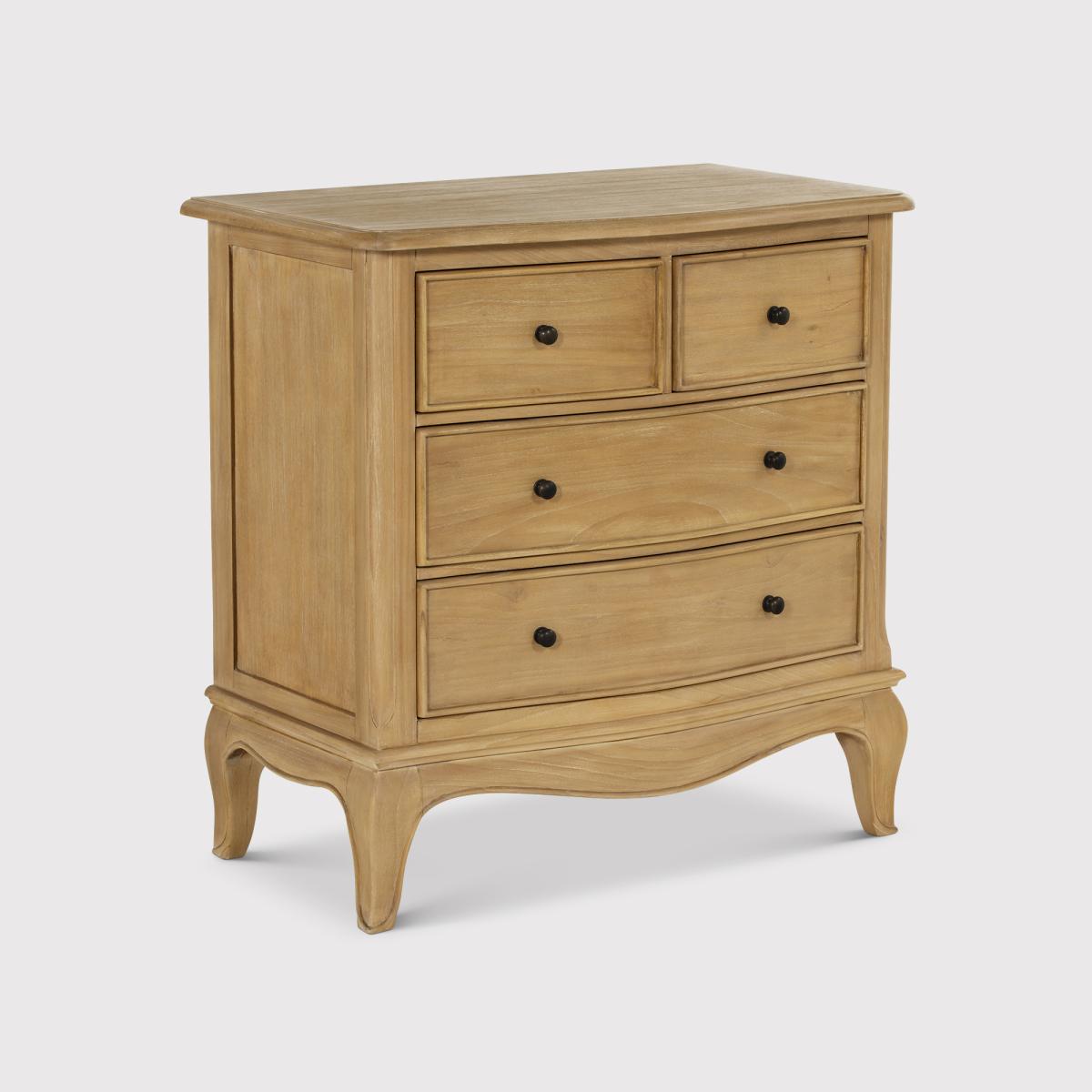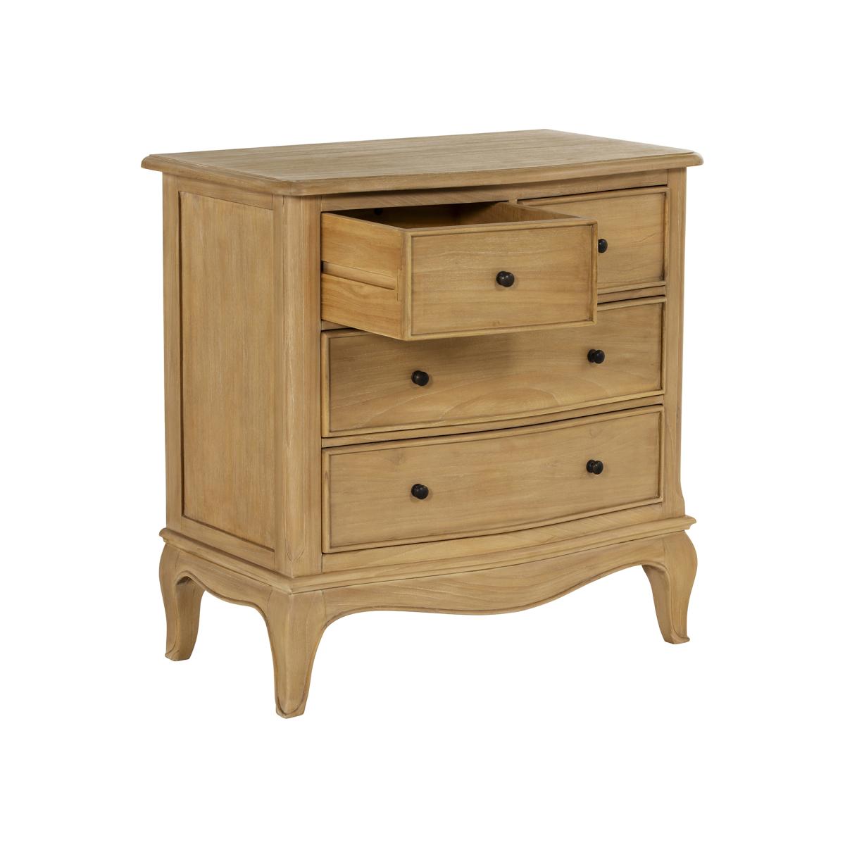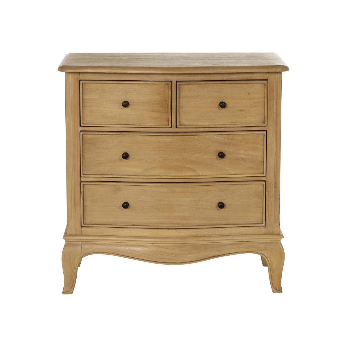 The Cecile Wooden 4 Drawer Chest has a classy look that is inherently French, the perfect traditional style for your bedroom. With a curvaceous design to the bottom and crafted from a gorgeous natural mindi wood, the Light Cecile Wooden 4 Drawer Chest is simple yet elegant, providing plenty of storage space with two small drawers at the top and two larger underneath.