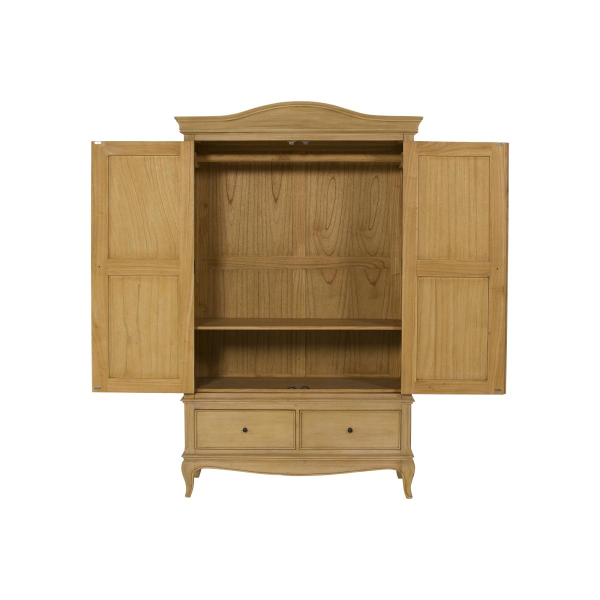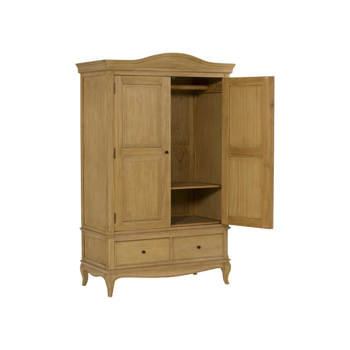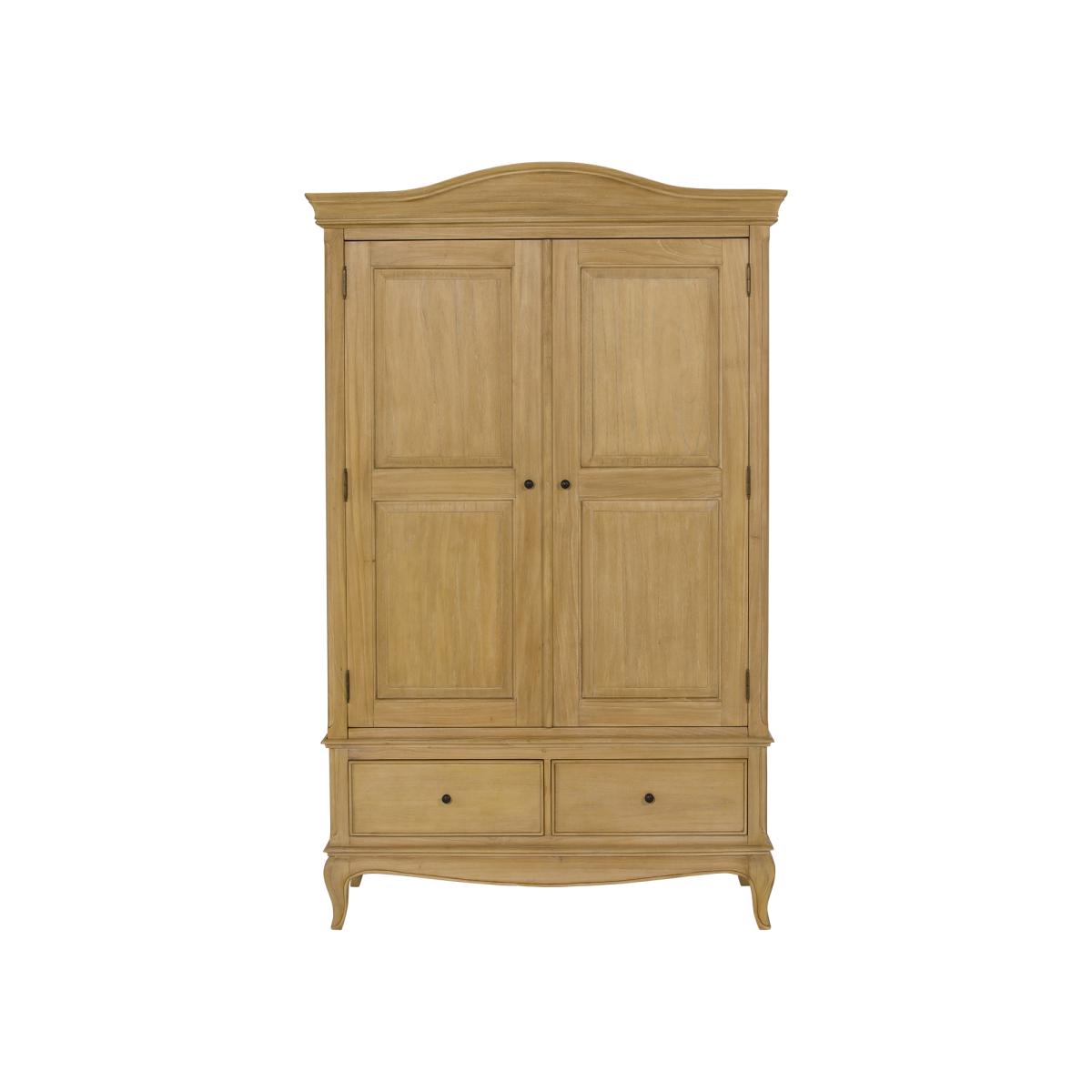 Displaying a nod to French style, the Cecile Neutral Wood Double Wardrobe adds a sophisticated and classic look to the room. With curvaceous edging, panelled door front and exposed hinges, the Cecile Double Wardrobe is full of small details that will enhance your traditional look. Complete with a hanging rail and two drawers at the bottom, it is every bit as practical as it is stylish, with an abundance of storage space to utilise.