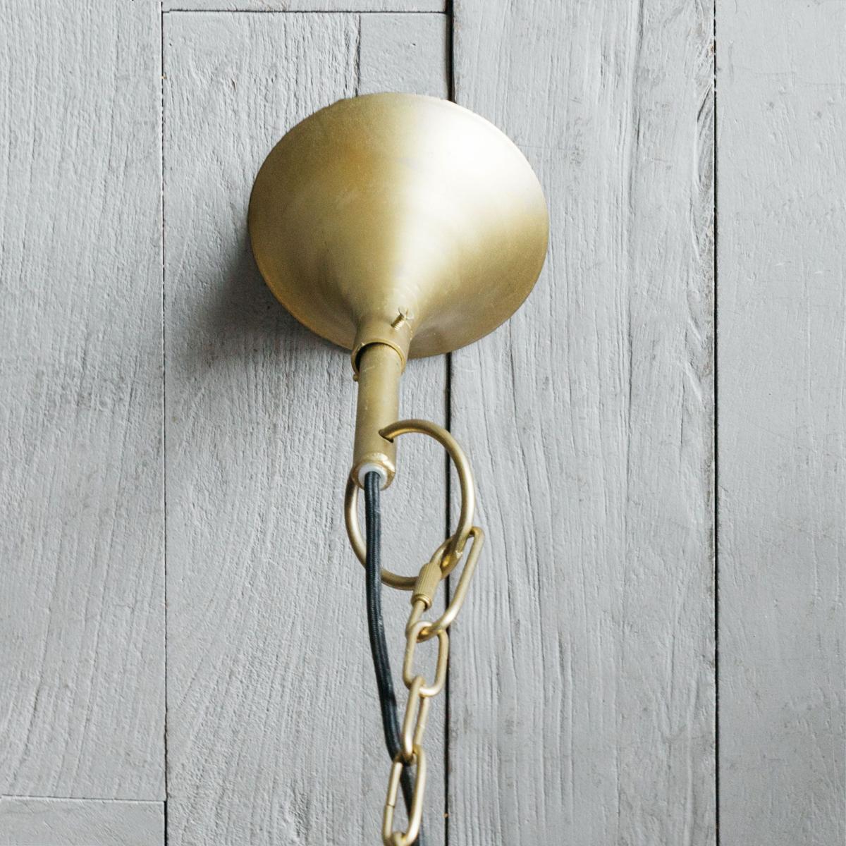 A striking pendant with an eye-catching design, featuring small double-layered brass circles mounted onto a cylindrical cage. Handcrafted from iron by talented artisans with a shiny brass finish.