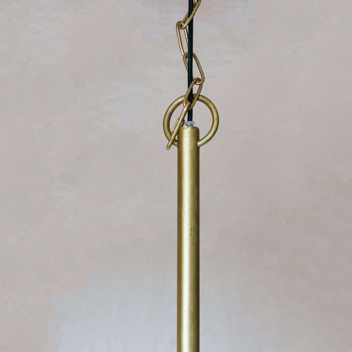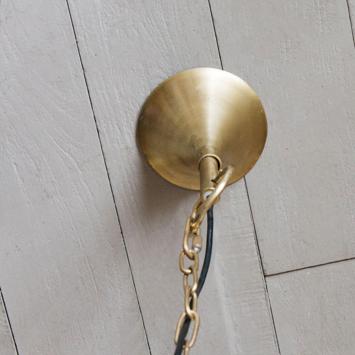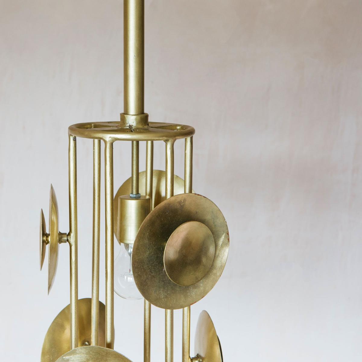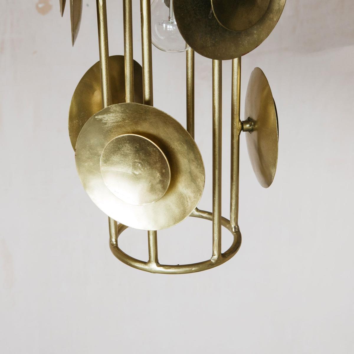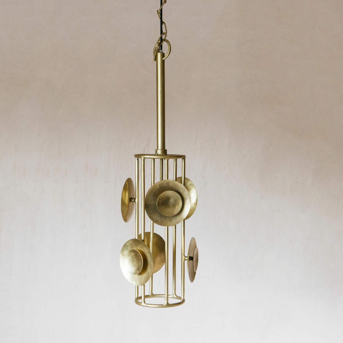 A striking pendant with an eye-catching design, featuring small double-layered brass circles mounted onto a cylindrical cage. Handcrafted from iron by talented artisans with a shiny brass finish.