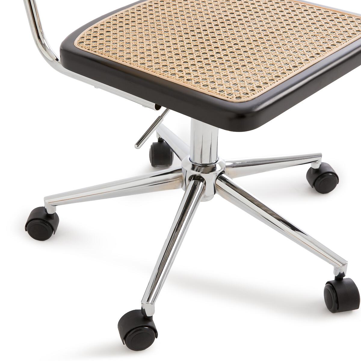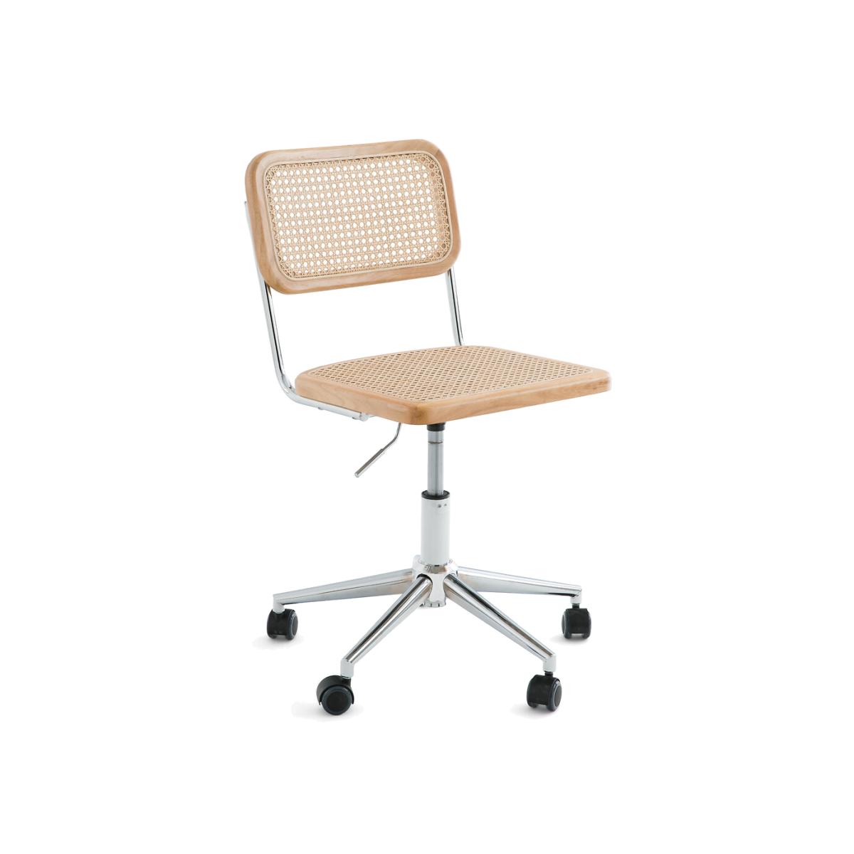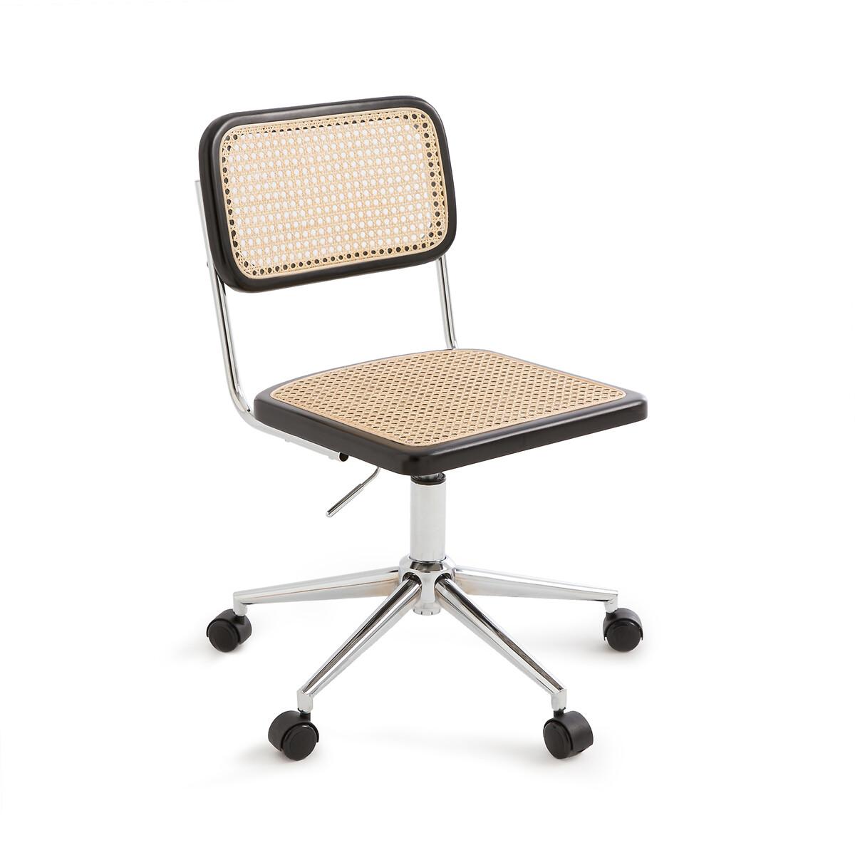 I love this portable office chair for its blend of functionality and minimal style. Its cane back and seat add a natural texture that works well in both modern and bohemian interiors, especially when paired with light wood or rattan accents. It's perfect in a home office that straddles contemporary and Scandinavian styles, offering a relaxed yet polished look. Practical styling tips include keeping the surrounding space bright and airy, perhaps complementing with woven baskets or soft textiles to enhance the natural aesthetic. Since it's mobile, it can easily be moved around for flexible arrangements or used as an occasional guest seat, making it versatile for various interior setups.