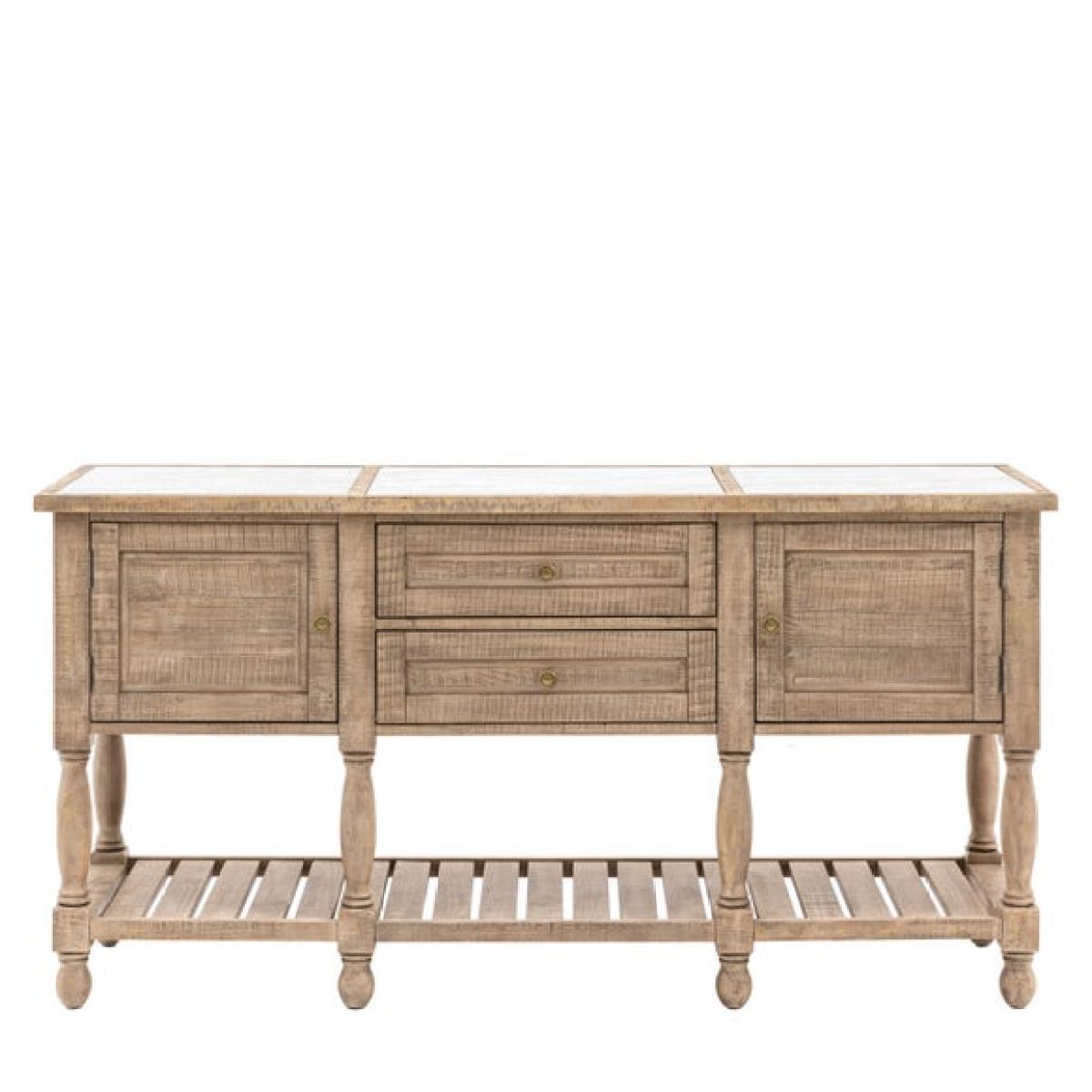 * Modern sideboard * Solid pine frame * Marble table top * Unique finish A beautifully compact storage solution that brings rustic charm and practical elegance to any room. With its solid pine construction and tactile cross-sawn finish, this piece offers a warm, natural aesthetic. The inset marble top adds a refined touch, while the combination of drawers and cupboard space ensures it’s as functional as it is stylish.