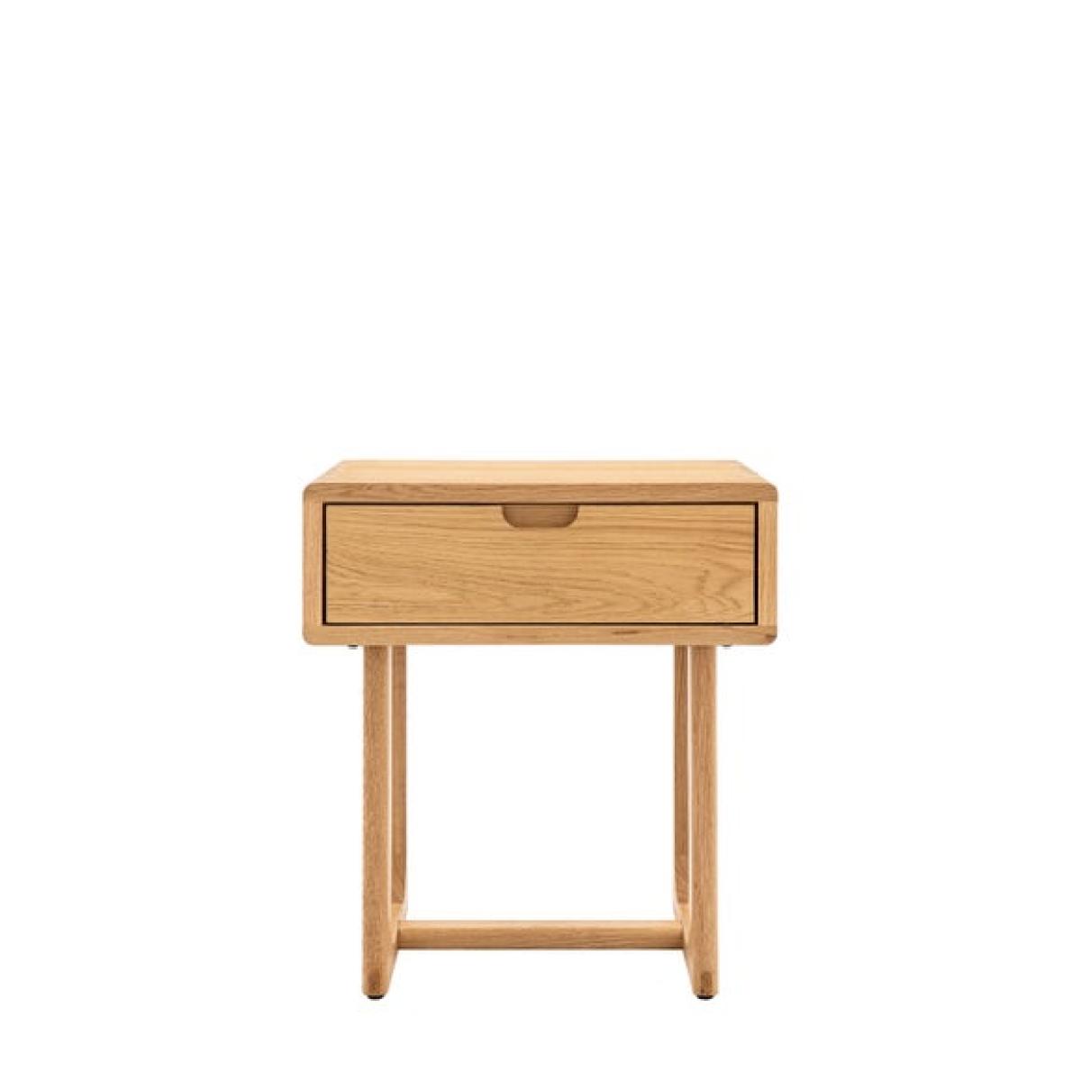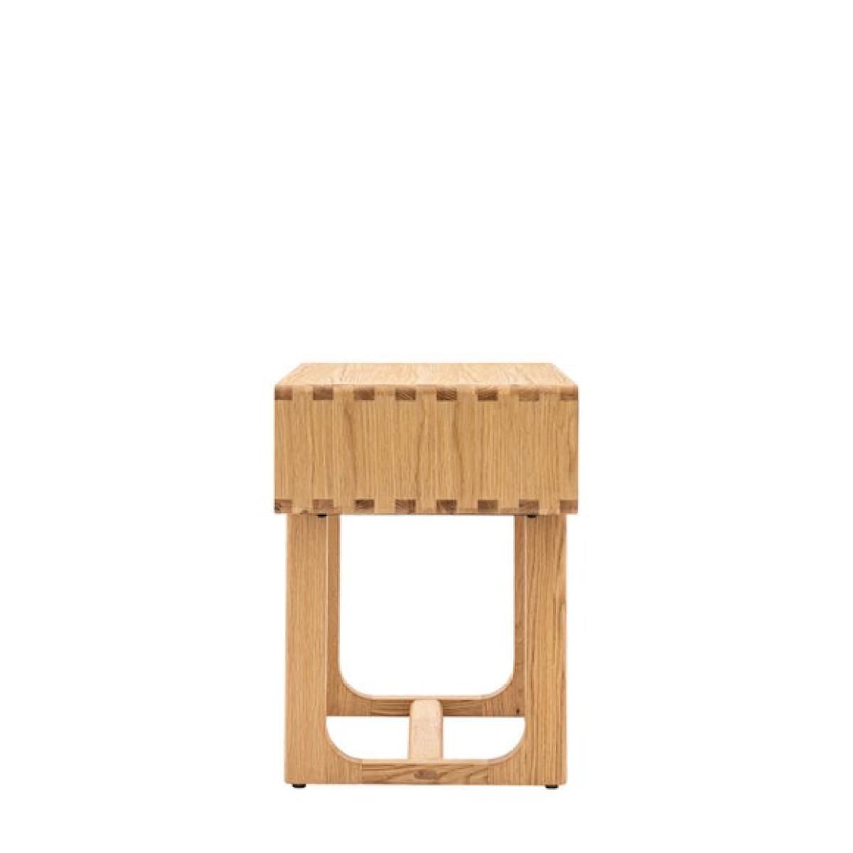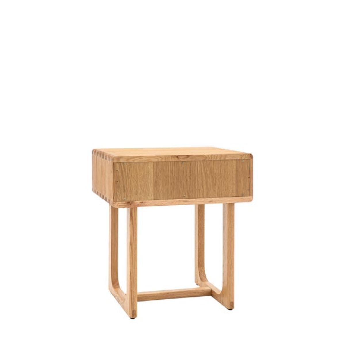 * Modern bedside table * Solid oak frame * Moulded handles * Matching pieces available A sleek and modern bedside companion that combines form and function. Crafted from solid oak with a natural finish, it features a unique cut-out handle and sculpted underframe for a contemporary look. The dovetail and finger-jointed construction ensures durability, while the single drawer offers convenient storage.