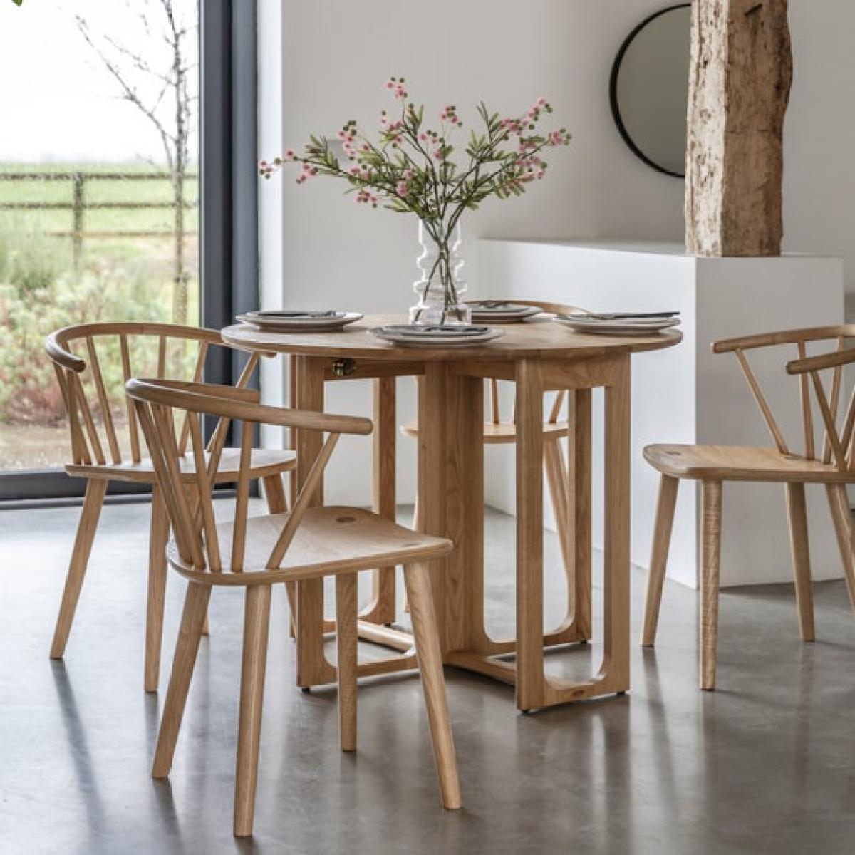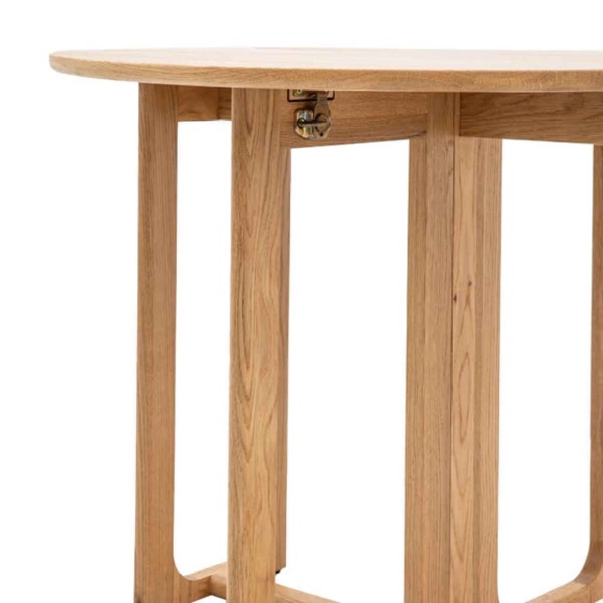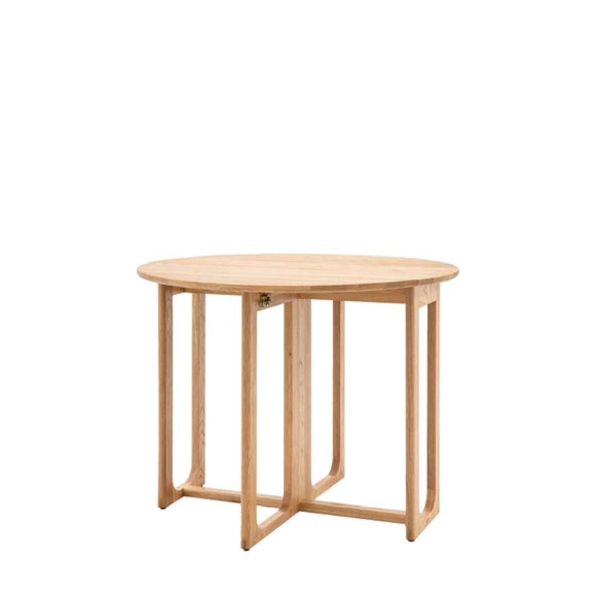 * Solid wood dining table * Space saving This dining table is a compact and convenient dining option that doesn’t compromise on style. Crafted from solid oak with a natural finish, it features a foldable design for easy storage. The clean lines and sculpted base make it a charming addition to smaller dining spaces.