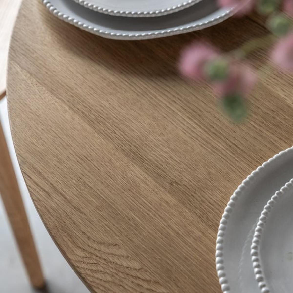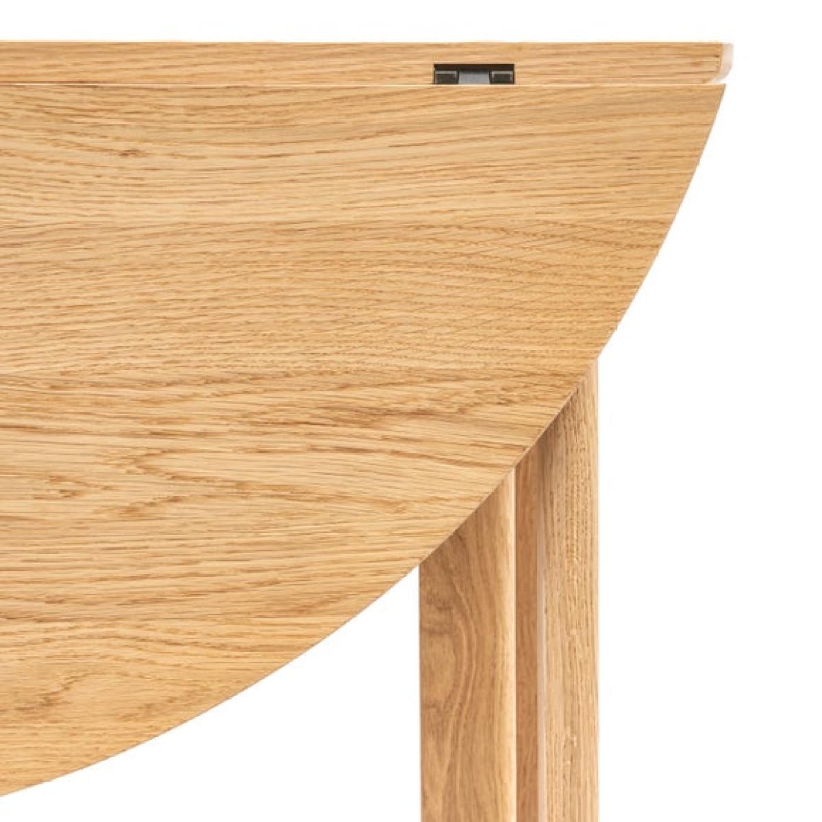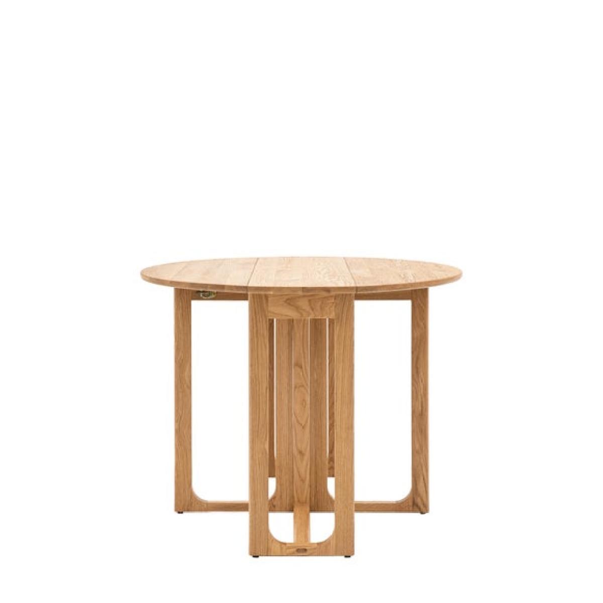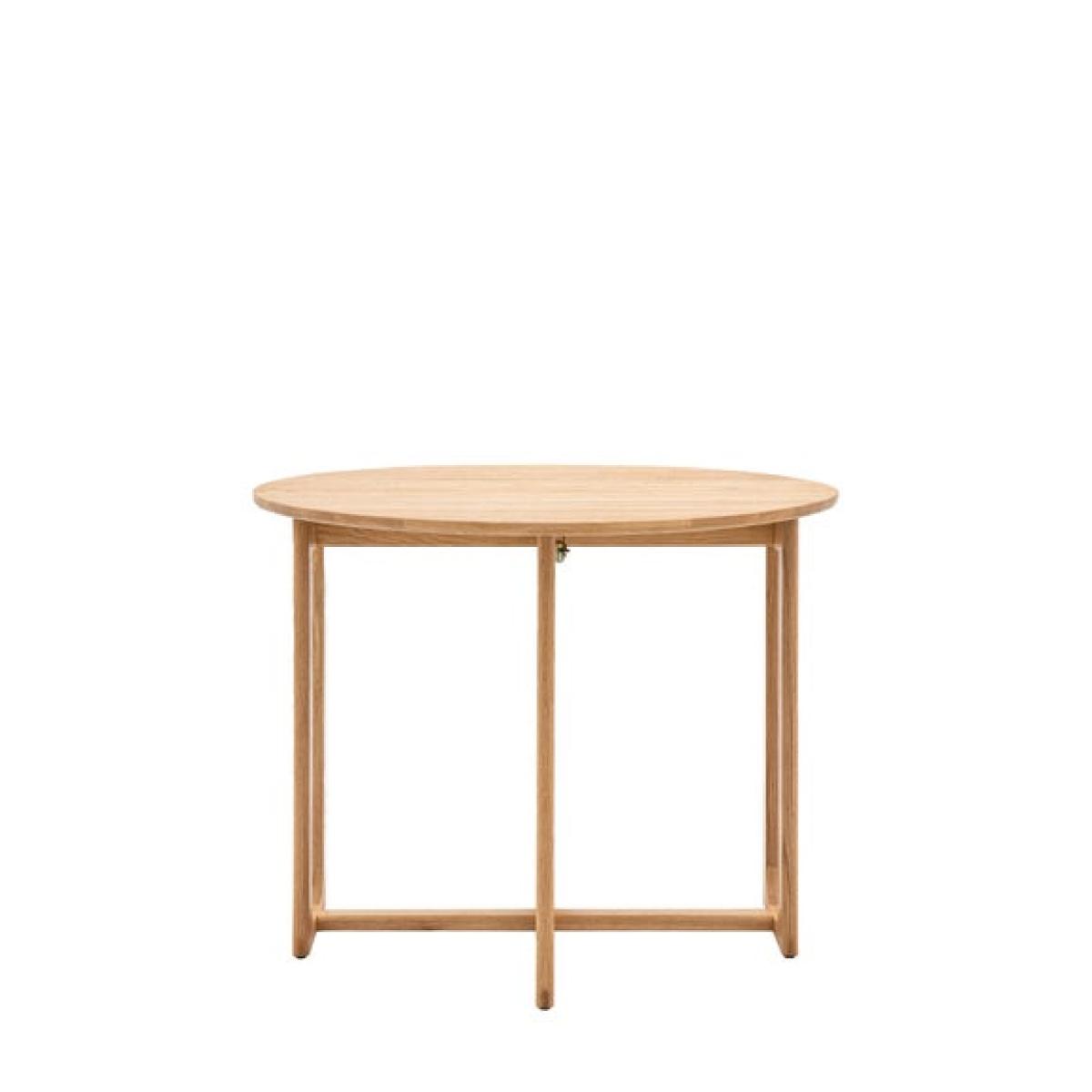 * Solid wood dining table * Space saving This dining table is a compact and convenient dining option that doesn’t compromise on style. Crafted from solid oak with a natural finish, it features a foldable design for easy storage. The clean lines and sculpted base make it a charming addition to smaller dining spaces.