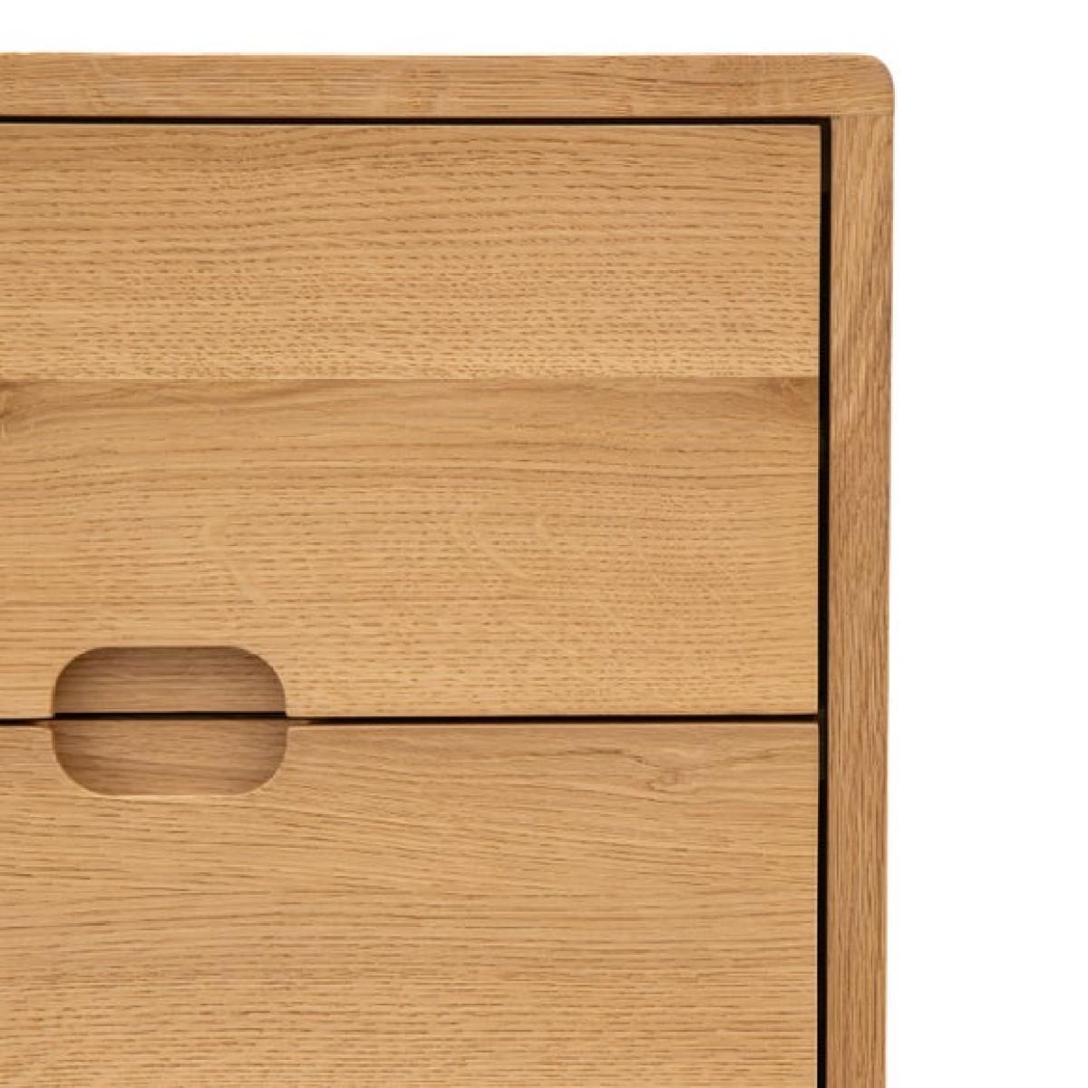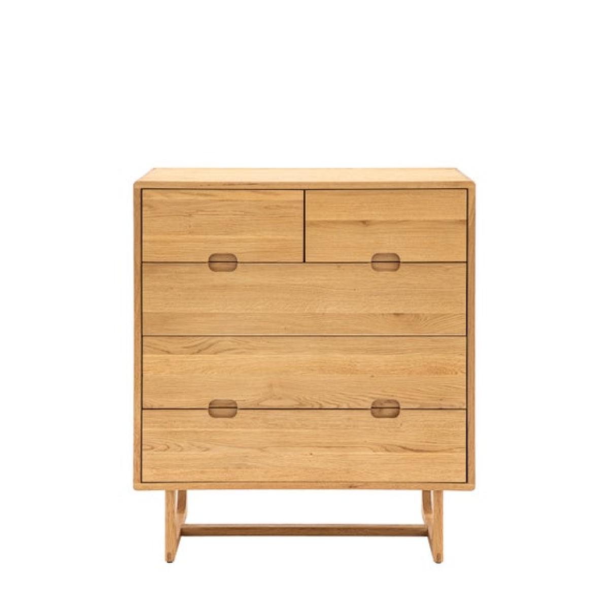 * Modern chest of drawers * Solid oak frame * Moulded handles * Matching pieces available These drawers are a stylish storage solution that combines modern design with traditional craftsmanship. The solid oak construction is finished naturally to highlight the wood’s beauty, while the cut-out handles and sculpted underframe add a contemporary touch. With five spacious drawers and dovetail joints, this chest offers both durability and elegance.