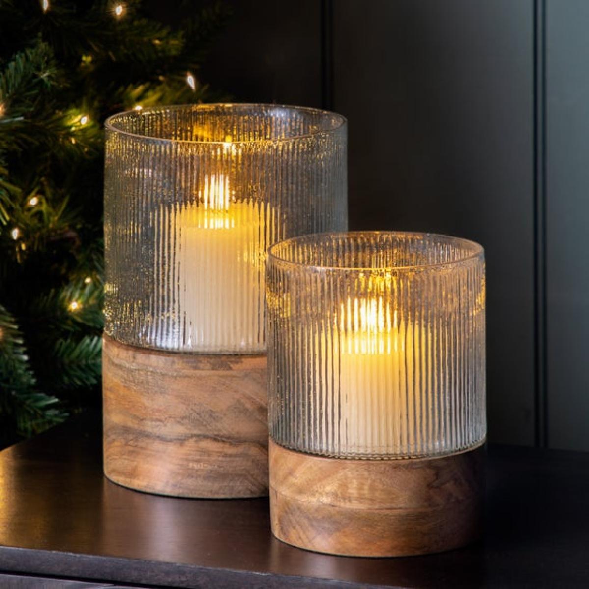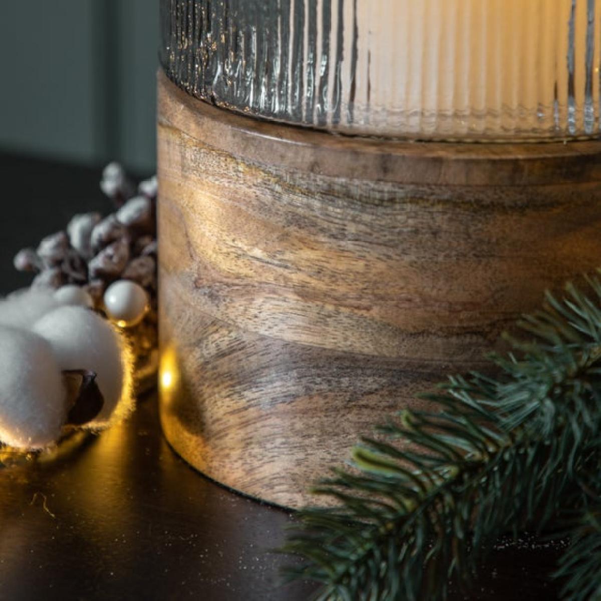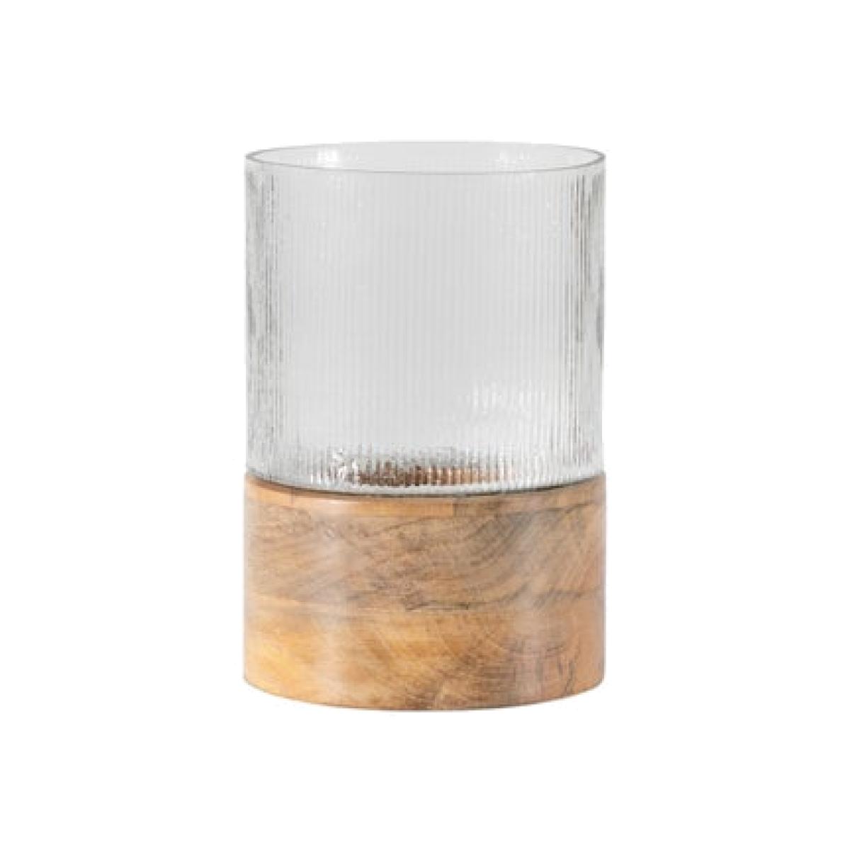 Cedar & Sage Belver Mango Wood & Fluted Glass Hurricane Candle Holder
