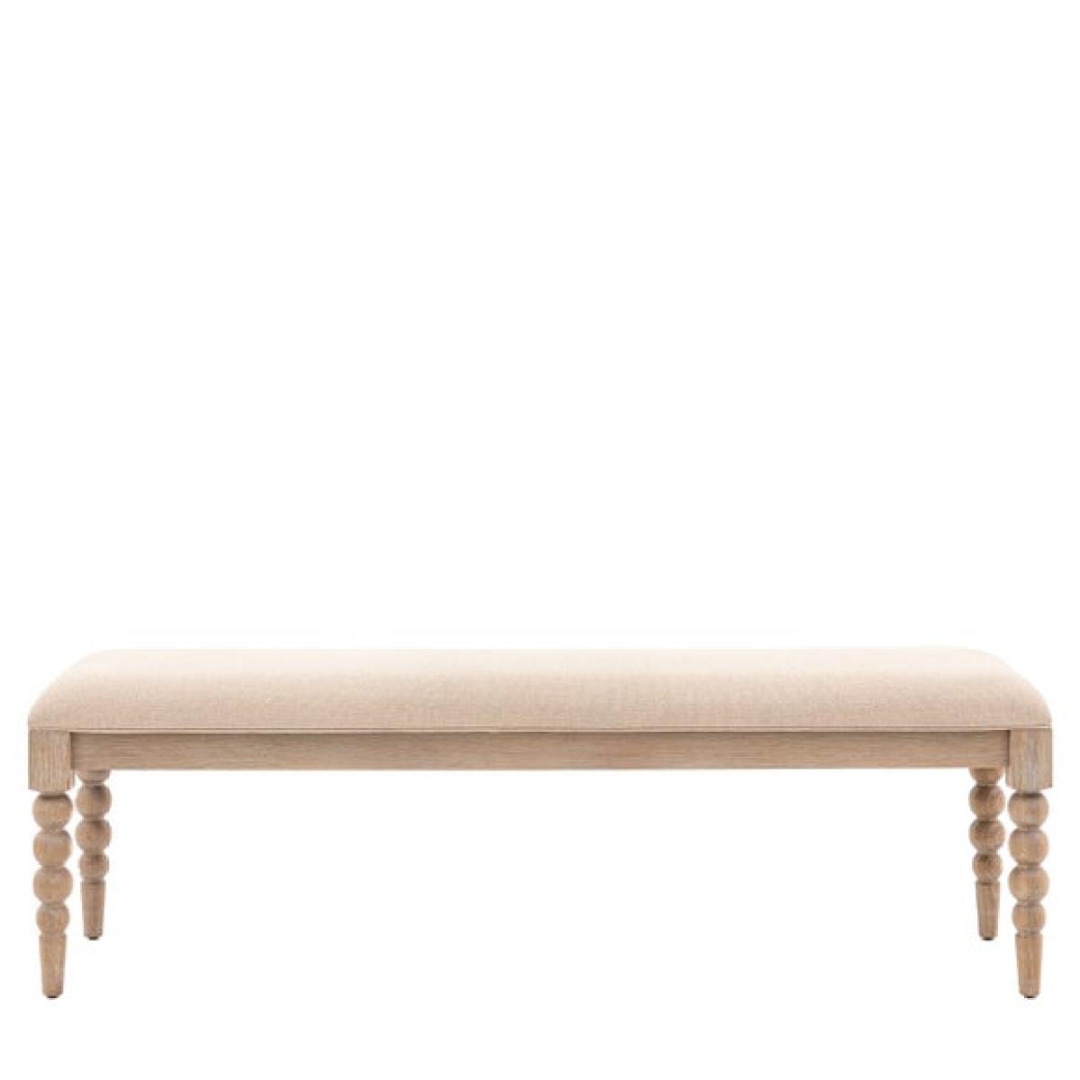 * Modern dining bench * Bobbin detailing * Solid oak frame * Lime washed finish Combining comfort and style, this upholstered bench features solid oak legs with hand-crafted bobbin detailing. The lime-washed finish adds a light and airy feel, making it a perfect companion to coordinating dining tables.