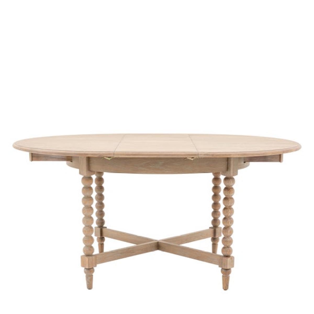 * Modern dining table * Bobbin detailing * Solid oak frame * Lime washed finish This round dining table combines classic design with modern functionality. The extendable top and hand-crafted bobbin legs make it both practical and stylish. The lime-washed finish adds a soft, elegant touch to your dining space.