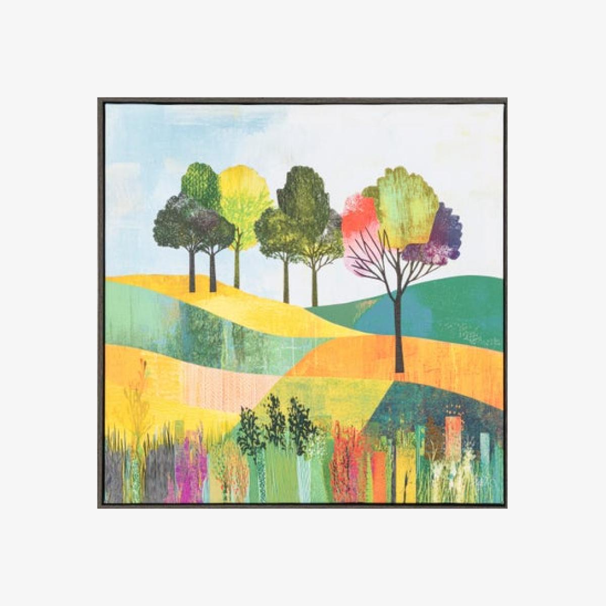 * Bright, stylised trees * Great splash of colour * Framed canvas - ready to hang * Charcoal grey wood-effect frame Bring bold colour and energy to your walls with the Cedar & Sage Bright Horizons Framed Canvas. This striking design features stylised trees in vivid tones, set against a soft blue and white backdrop for a fresh, uplifting look. Rich textures and layered patterns add depth and interest, making it a perfect statement piece. Finished with a charcoal grey wood-effect frame and ready to hang, it’s an effortless way to brighten any space.
