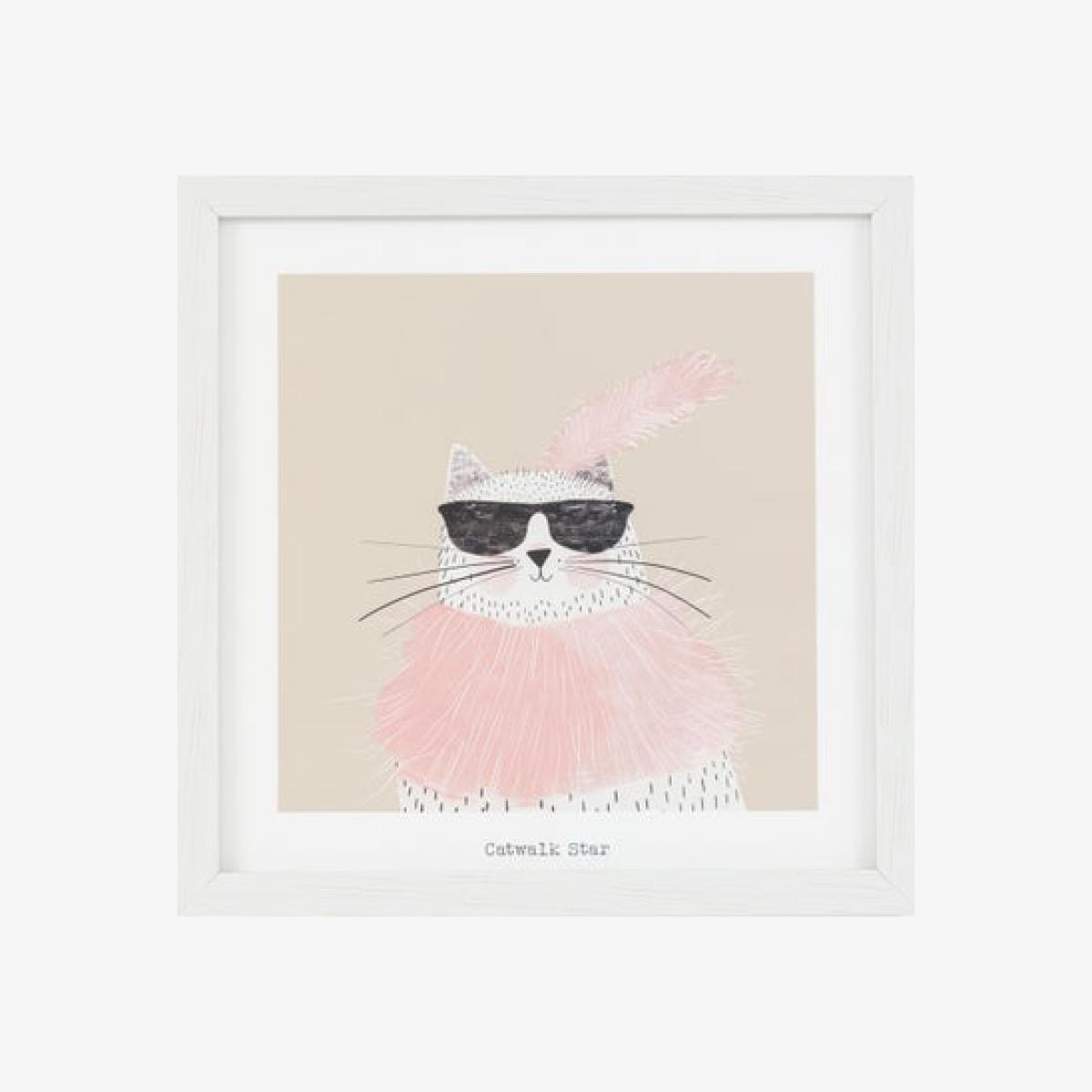 * Playful fashionista cat * Illustration style print * Soft colour palette * Framed and ready to hang Show off your playful side with the Cedar & Sage Catwalk Star Framed Print. This stylish feline steals the spotlight in oversized sunglasses, a fluffy pink scarf and a feathered hat, bringing a touch of glamour to any room. Muted tones of pink, cream and beige are accented with hints of black for a chic, contemporary look. Finished with a simple off-white wood-effect frame and ready to hang, it’s the perfect way to add personality to your décor.