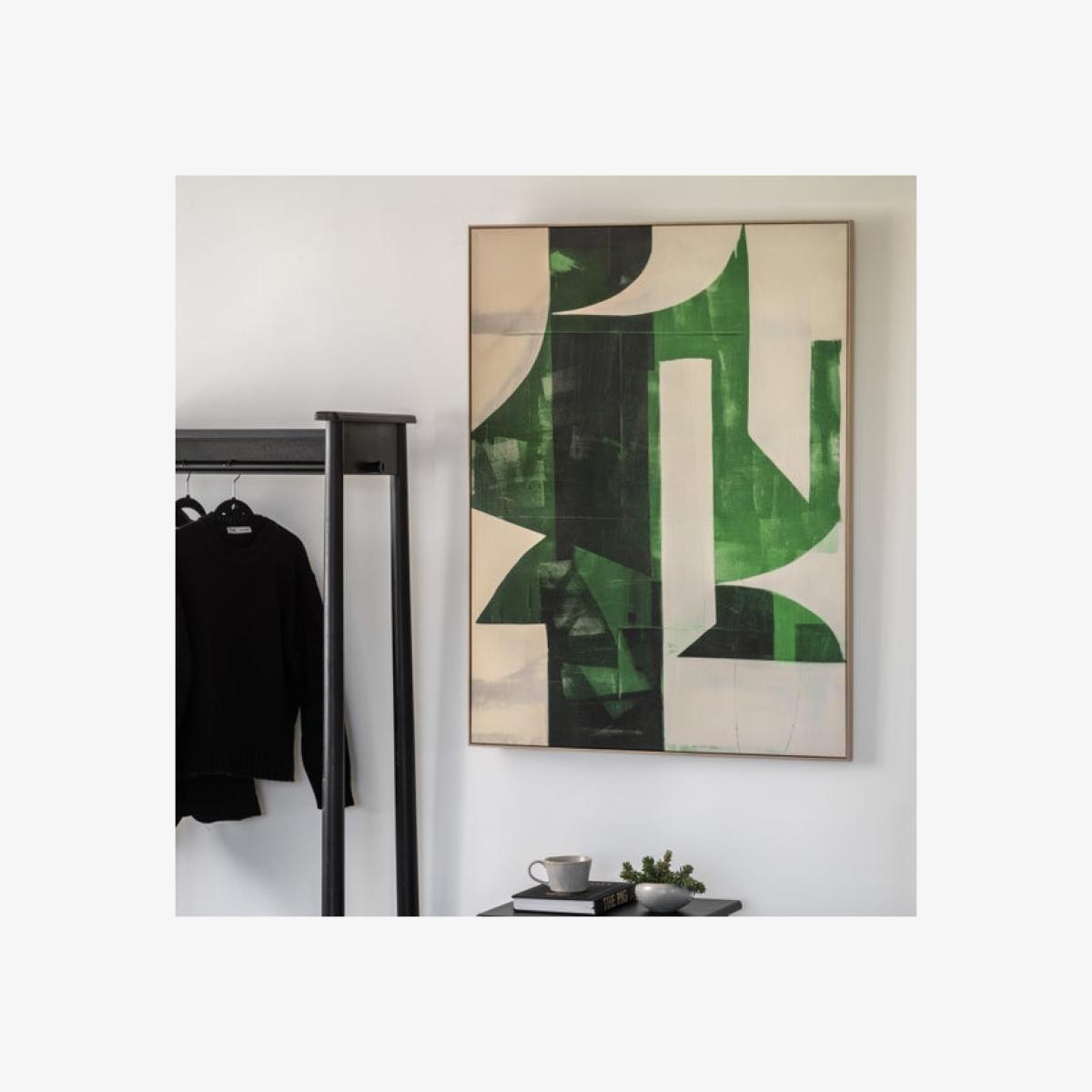 * Framed canvas * Vibrant emerald green * Geometric abstract artwork Add a bold pop of colour to your space with this framed canvas from Cedar & Sage. Featuring a vibrant emerald green palette and geometric abstract design, it brings modern energy and artistic flair to your walls. The simple frame gives it a high-end, gallery-style finish, making it perfect for contemporary interiors.