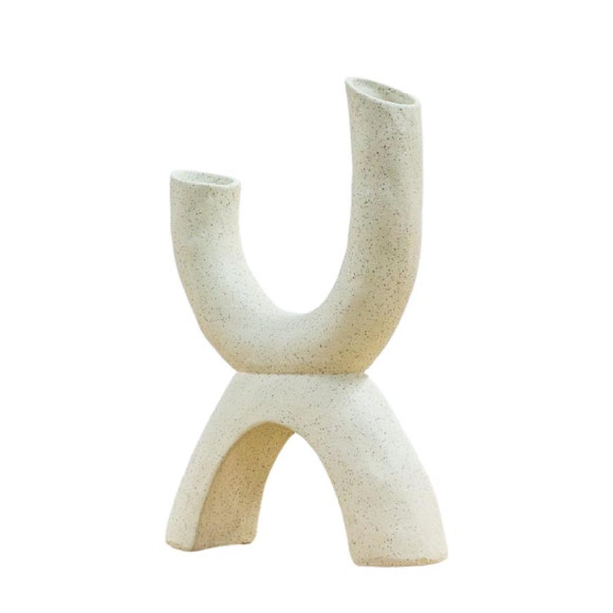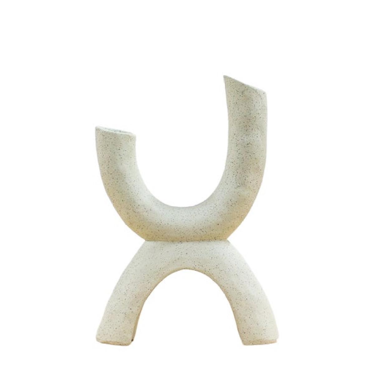 * Abstract shape * Matt white glaze * Unique piece Make a bold statement with the Jago Large Abstract Vase. Its organic double 'U' silhouette draws inspiration from natural forms, offering a sculptural presence that stands out in any setting. The matt textured glaze adds a soft, tactile finish that complements its striking shape. Ideal for minimalist or modern interiors, it works beautifully as a standalone piece or paired with dried stems. A unique addition that brings quiet drama to your décor.
