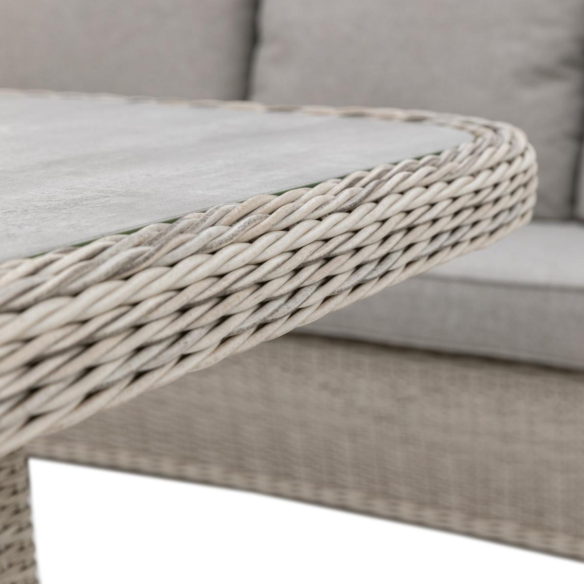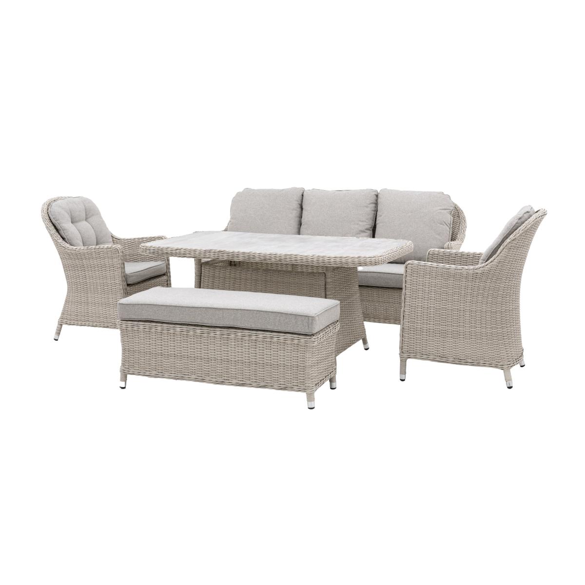 * 1 x sofa, 2 x armchairs, 1 x bench and 1 x table * Rattan design * Durable and waterproof This spacious dining set is perfect for family meals or larger gatherings, offering comfortable seating for everyone. Crafted from durable, weather-resistant materials, it is built to last and maintain its aesthetic appeal through all seasons. The minimalist design adds a contemporary touch to your outdoor space, making it a versatile addition to any garden or patio.