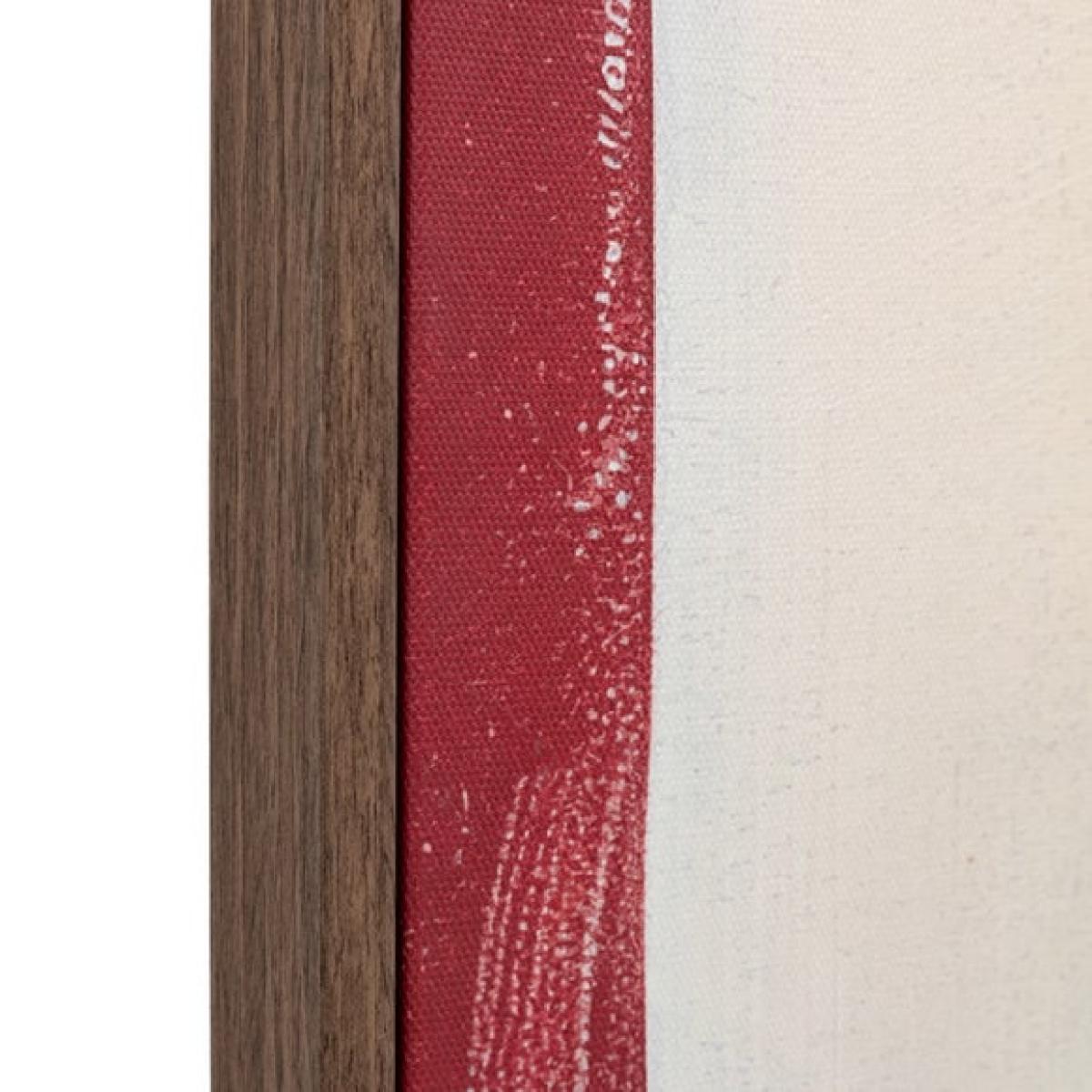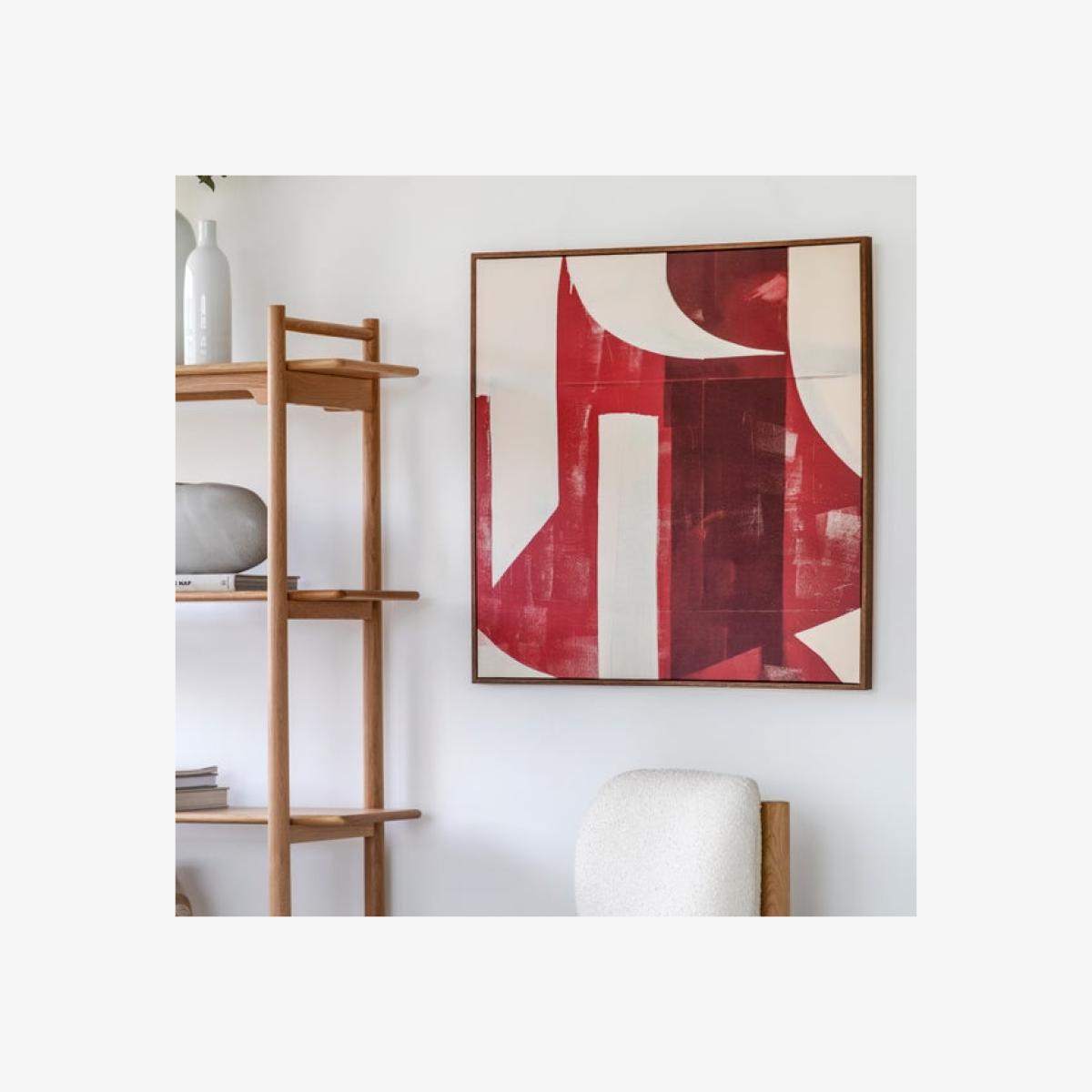 I love how the Ruby abstract canvas brings a bold splash of colour and modern energy to a space. It works particularly well in contemporary or minimalist interiors, acting as the focal point in a neutral scheme. This piece pairs nicely with natural textures and wooden furnishings, as seen in the image, creating a balanced yet striking look. For practical styling tips, consider framing it above a sofa or sideboard to anchor the room, or group it with other abstract works in a gallery wall for a curated effect. Keep surrounding accessories simple to let the artwork stand out, and consider incorporating similar red or earthy tones in cushions or throws to create visual cohesion.