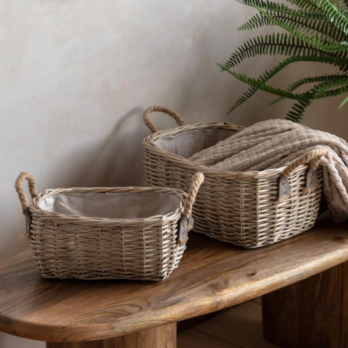 * Set of 2 baskets * Versatile storage * Rope carry handles * Oval woven shape * Lined with fabric The Eden Set of 2 Oval Baskets offers a stylish way to keep your home organised. Made from natural woven material and lined with soft cotton fabric, they bring a rustic yet refined feel to any space. Rope handles make them easy to carry from room to room, whether you're storing laundry, toys or household bits. Their oval shape adds a gentle, natural touch to corners and shelves. A practical pair that blends seamlessly into both modern and traditional interiors.