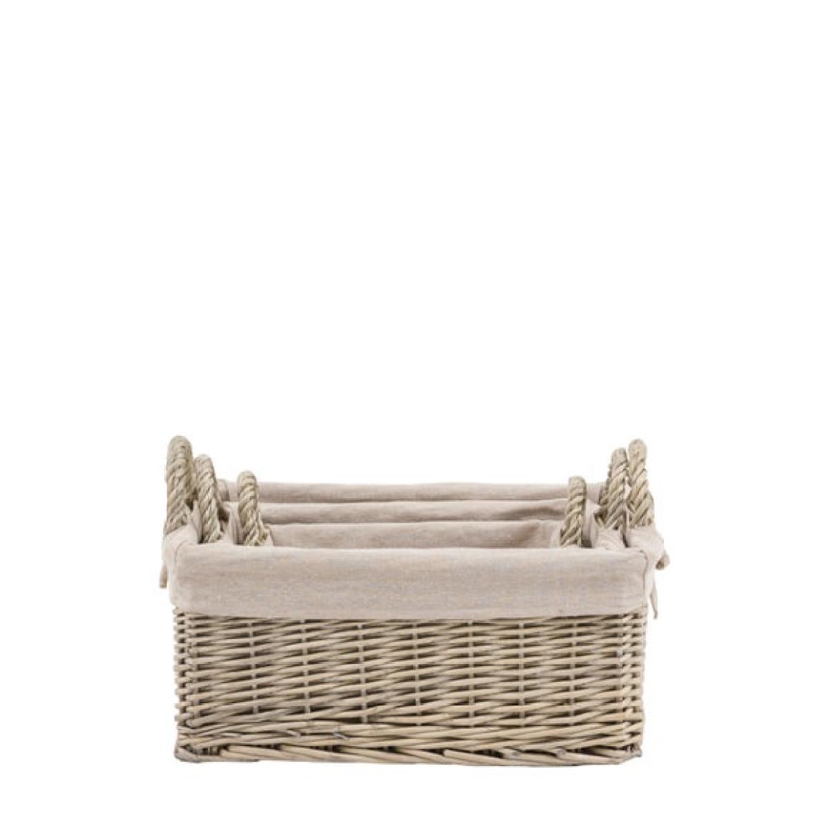 * Set of 3 baskets * Natural colour * Rope handles * Cotton lined * Rectangular shape The Rama Set of 3 Lined Baskets offers a stylish and practical way to keep your home organised. Made from natural woven willow and lined with soft cotton, they’re ideal for storing anything from trinkets to toys and will nest neatly together when not in use. Each basket features rope handles for easy carrying, making them perfect for everyday use, and their neutral design blends effortlessly into a range of interiors. A versatile trio that brings calm and order to your space.
