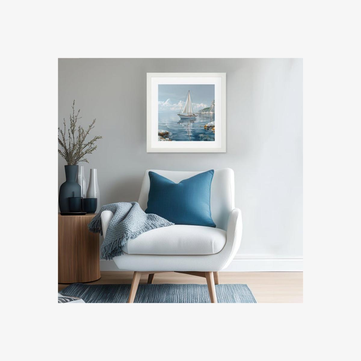 * Tranquil seascape with sailboat * Soft reflections and gentle sky tones * Framed and ready to hang * Brings a coastal feel to your décor This peaceful seascape brings a sense of stillness to your space. A lone sailboat glides across calm water, with rocky shores and distant cliffs adding depth to the scene. The soft reflections and gentle sky tones create a relaxed, open feel. It’s the kind of piece that works quietly in the background, adding atmosphere without taking over. Framed and ready to hang, it’s a simple way to bring a coastal touch indoors.