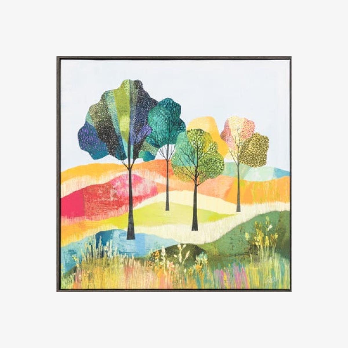 * Stylised trees * Vibrant colours * Framed canvas - ready to hang * Charcoal grey wood-effect frame Bring energy and colour to your walls with the Cedar & Sage Vibrant Fields Framed Canvas. Bold, stylised trees stand against a soft, pale sky, creating a striking contrast that draws the eye. Rich tones and layered textures add depth and intrigue, making this piece a perfect statement for any interior. Finished with a charcoal grey wood-effect frame and ready to hang, it’s an effortless way to refresh your space with vibrant style.