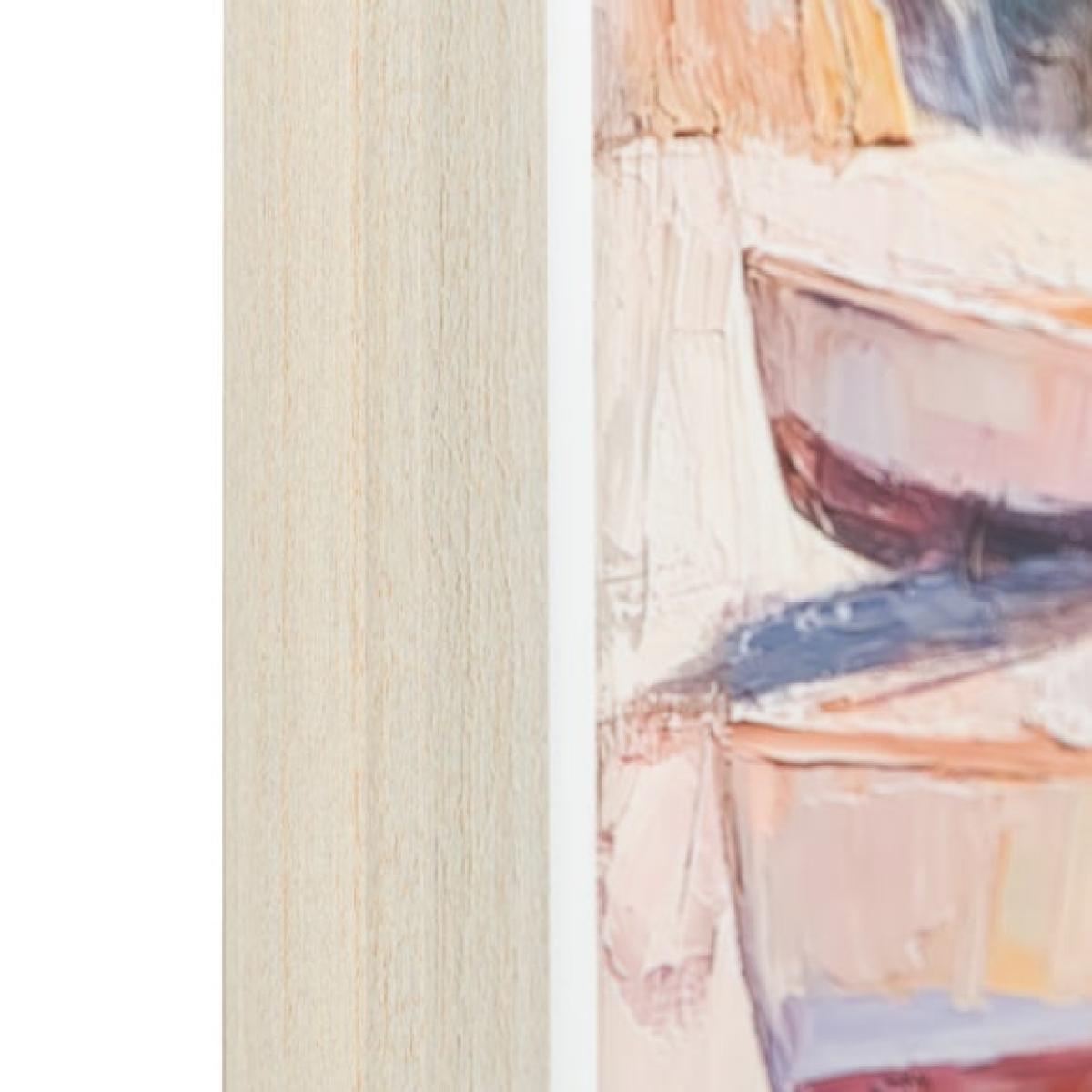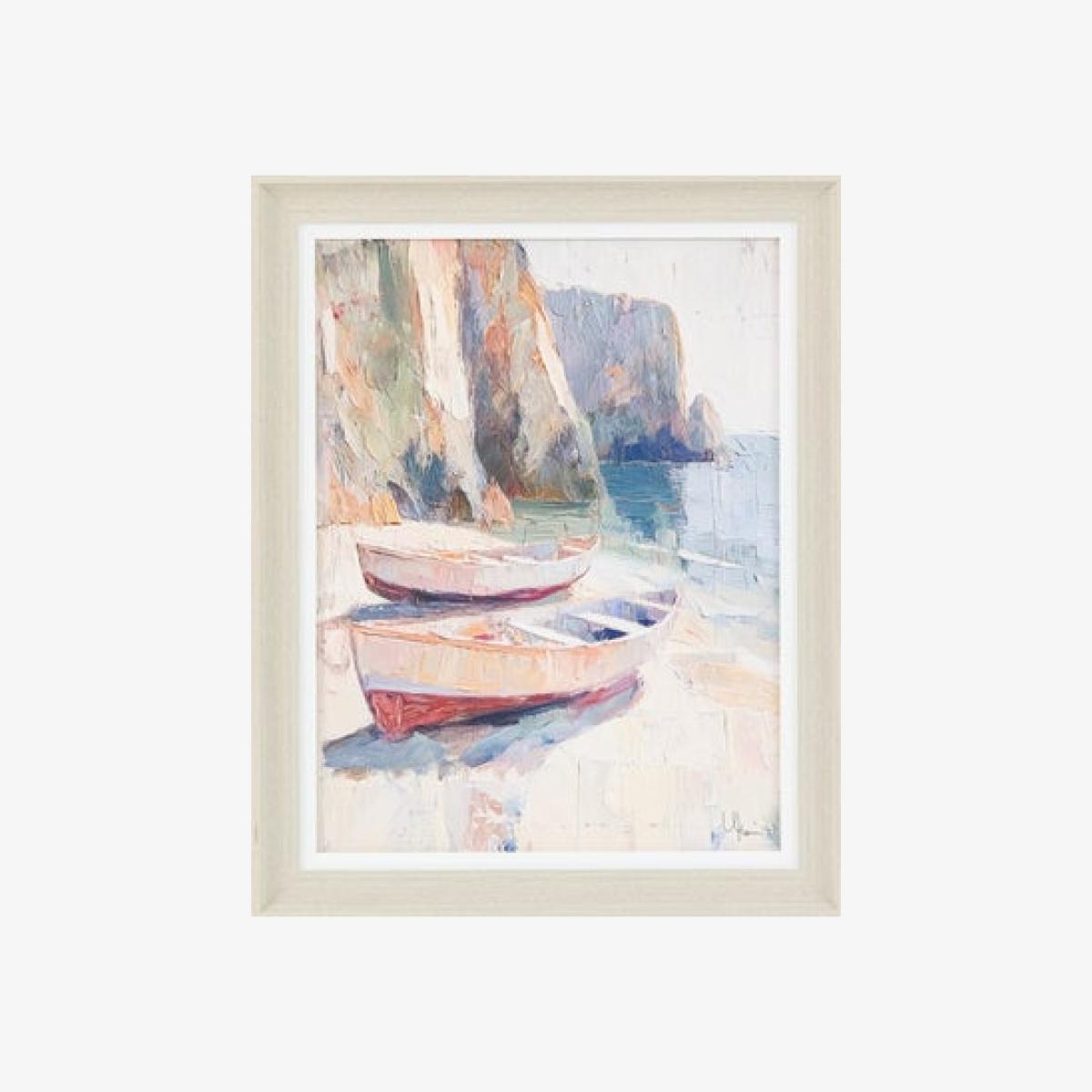 * Calming coastal scene * Sailboats and cliffs * Soft colour palette * Framed and ready to display Bring a sense of coastal calm to your walls with the Cedar & Sage Whispering Shores Framed Print. Textured brushstrokes and a soft, sunlit palette capture a serene cove, where two small boats rest on the sandy shore beneath soaring cliffs and blue-green waters. Gentle detailing adds depth and tranquility, making it a soothing focal point for any room. Finished with a pale wood-effect frame with white lip, it’s ready to hang for an effortless style update.