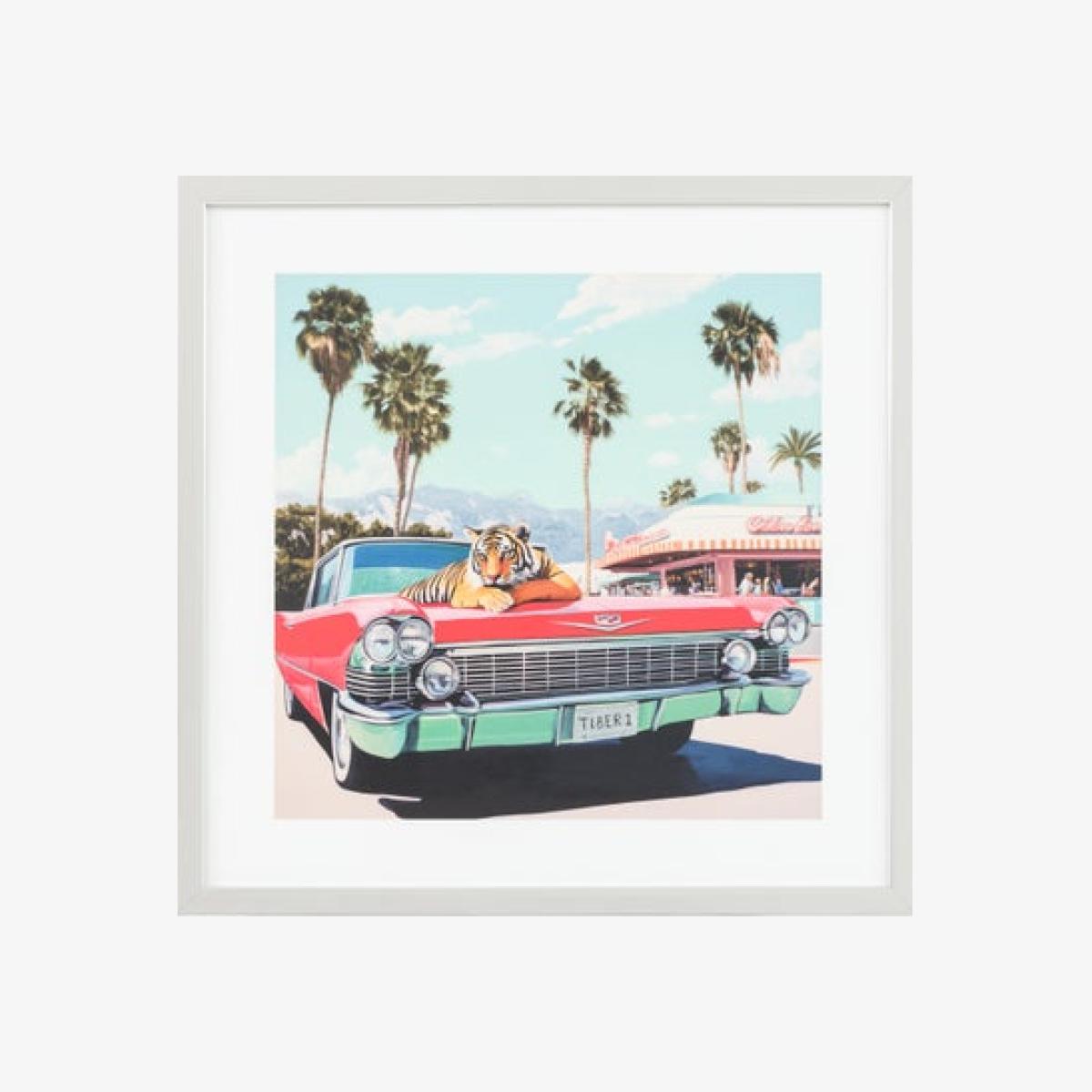 * Retro meets surreal * Tiger on a vintage Cadillac * Framed print * Ready to hang Make a statement with the Cedar & Sage Wild Rest Stop Framed Print. This striking artwork blends retro Americana with a touch of the surreal, featuring a majestic tiger lounging on the bonnet of a vintage Cadillac. A classic diner backdrop and tropical palms complete the vibrant Miami-inspired scene. Finished in a sleek silver chrome frame and ready to hang, it’s perfect for adding bold personality to your space.