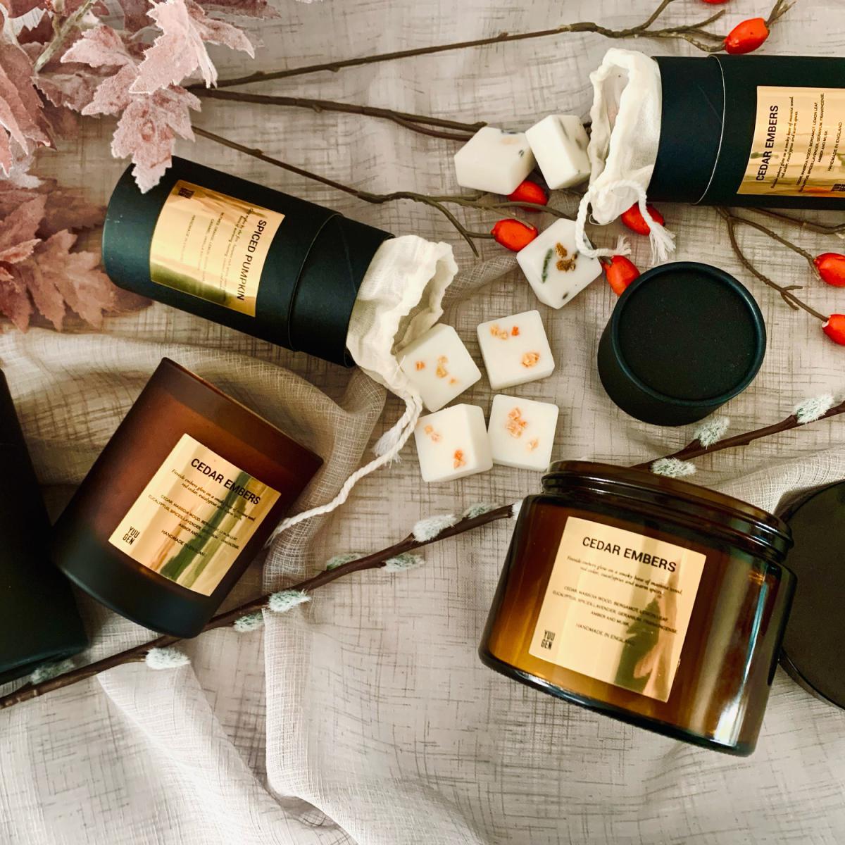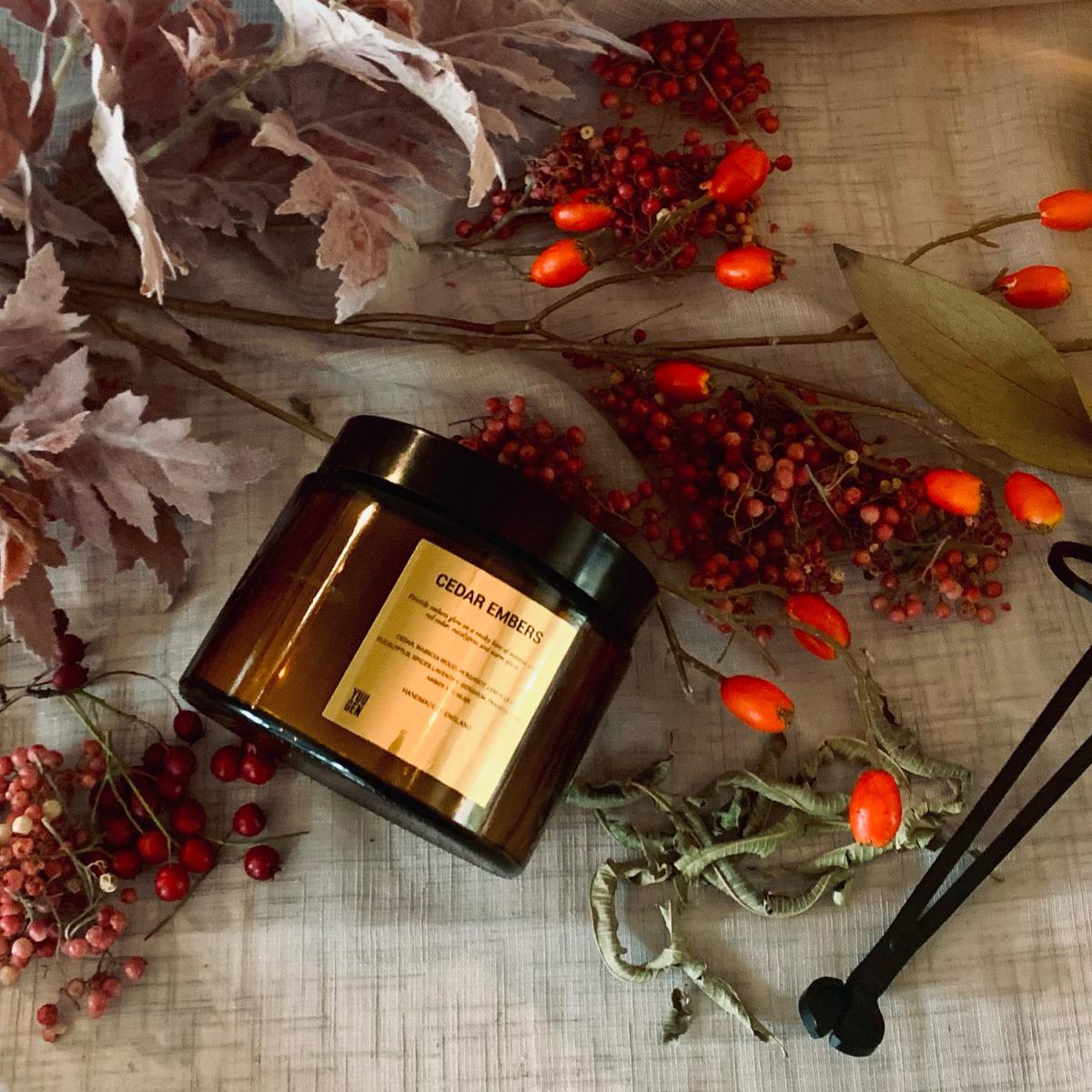 Fireside embers glow on a smoky base of massoia wood, red cedar, eucalyptus and warm spices. Crisp top notes of bergamot, lemon leaf and warming spices, fresh eucalyptus, lavender and geranium. The base of this fragrance is exotic and full with red cedar, massoia wood, amber, frankincense and musks. Top notes: Bergamot, Lemon Leaf, Eucalyptus. Middle notes: Spices, Lavender, Geranium. Base notes: Cedar, Massoia Woods, Amber, Frankincense, Musk. Each dual wick candle is made with our very own blend of Coconut and Rapeseed wax, and packed with a unique fragrance. All of our candles have been lovingly handmade and hand-poured using only the finest of ingredients.