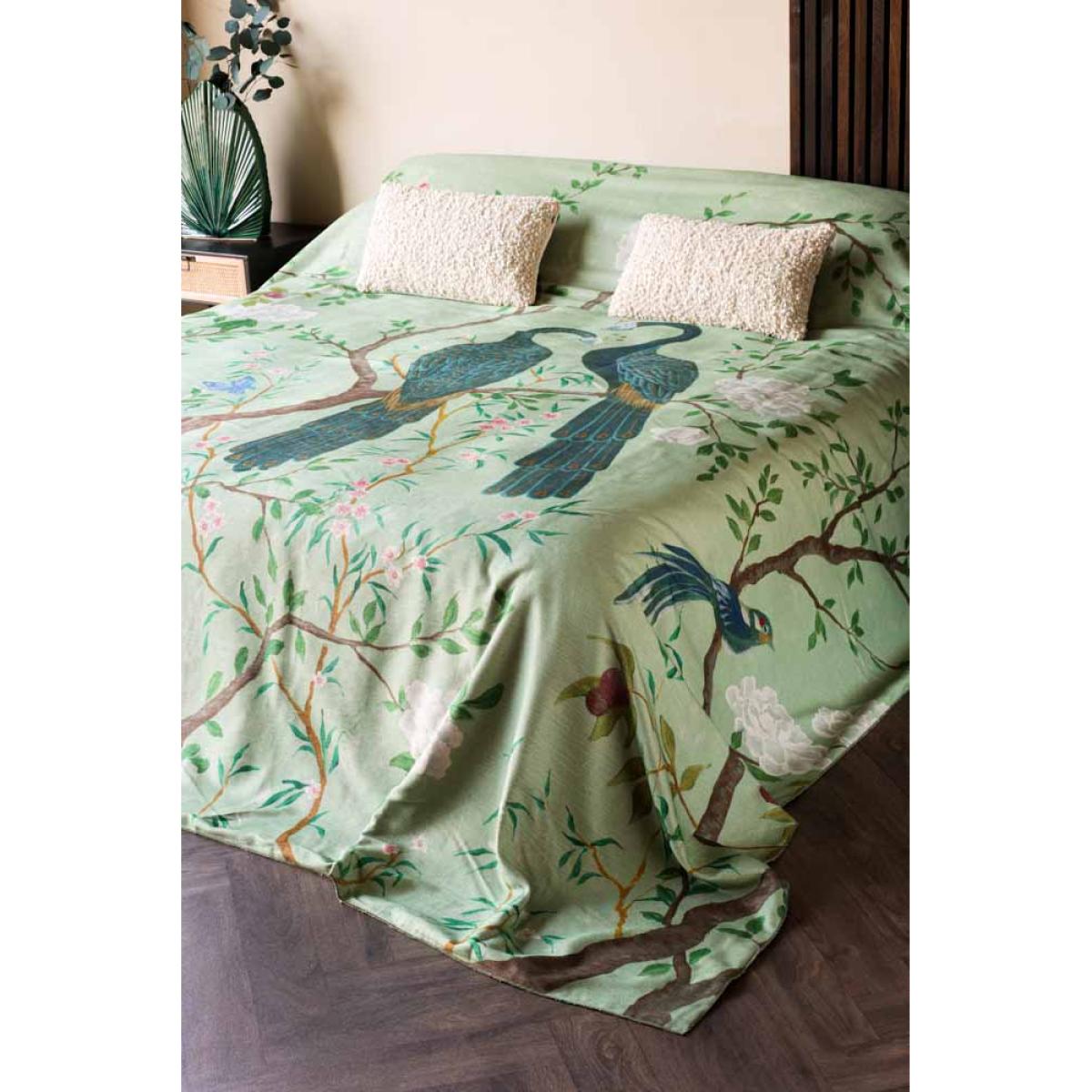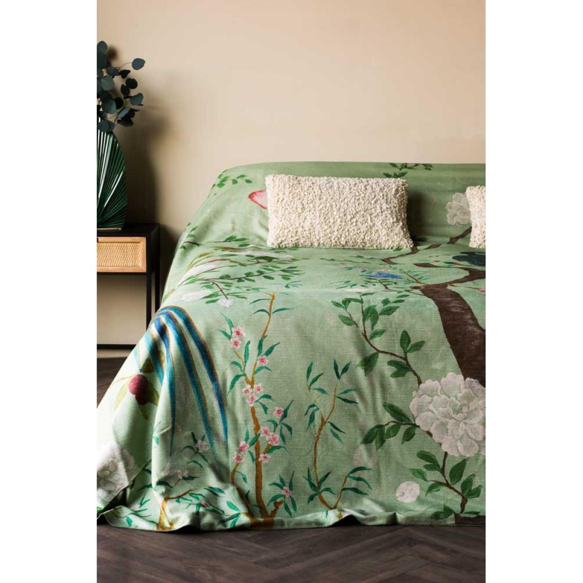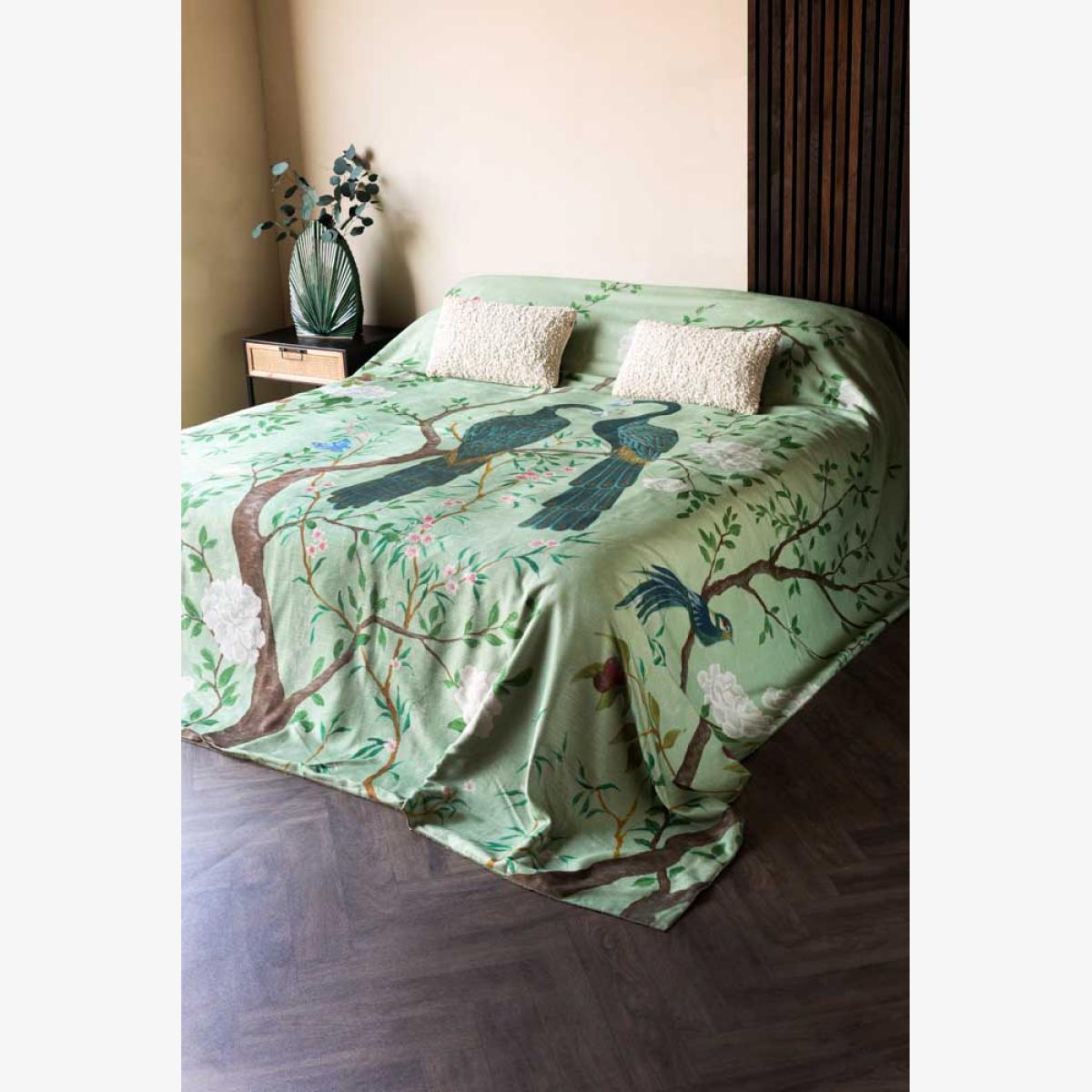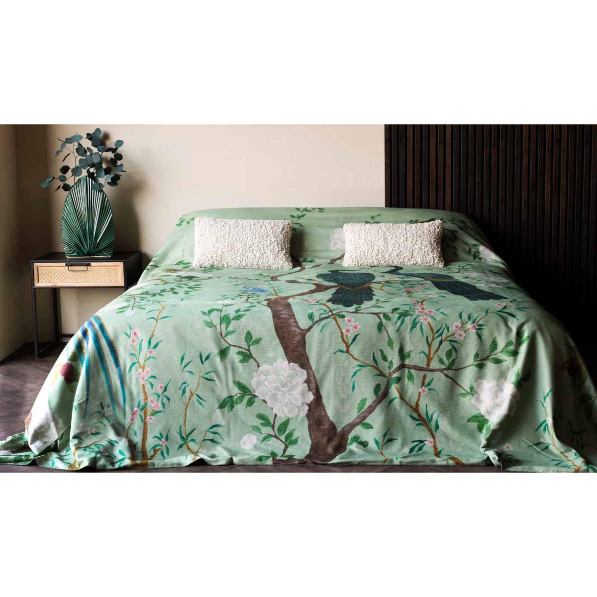 About The Cedomin Quilt Tapestry Throw In Mint The Cedomin Quilt Tapestry Throw In Mint is a beautiful Chinoiserie-style soft furnishing. Measuring 280cm in height and 280cm in width, this extra-large throw blanket showcases elegant peacocks perched in a blossom tree. Showcasing a serene mint green backdrop, this Chinoiserie quilt is made from heavy cotton, viscose and linen. It’s also quite massive so can be used to create a striking mural that fills an entire large wall in your home. Showcasing a relaxing and meditative design, this peacock quilt is perfect for injecting a naturistic atmosphere into your home. Why We Think You’ll Love The Cedomin Peacock Tapestry Throw In Mint Showcasing a mesmerising design in a youthful mint green colour, this large throw invites a feeling of tranquillity. What’s more, its naturistic style is expressed through not only the birds but the combination of colours and forms that make up the entire piece of art. Showcasing a feeling of harmony and delight, we think this large bedroom quilt is to die for! Where To Style The Cedomin Peacock Chinoiserie Tapestry In Mint Create a dreamy sleeping space by displaying this as a decorative soft furnishing on top of your bed. Its beautiful design will inject a unique charm into the space showcasing that much loved wow factor from the moment you enter the room. Alternatively, this green throw is large enough to be styled as a spectacular wall tapestry. We can guarantee it’ll create dramatic impact within your space.