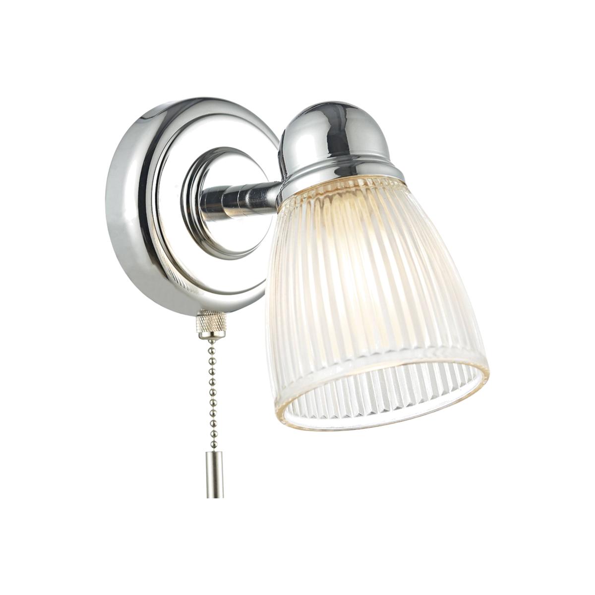 Modern wall light boasting a polished chrome finish. A stylish addition to your bathroom, this wall light is part of the Cedric range. Finished in polished chrome throughout, the fitting features a ribbed glass shade to house the light bulb and is operated using a pull cord mechanism. It is set to look great in both traditional and modern bathrooms.