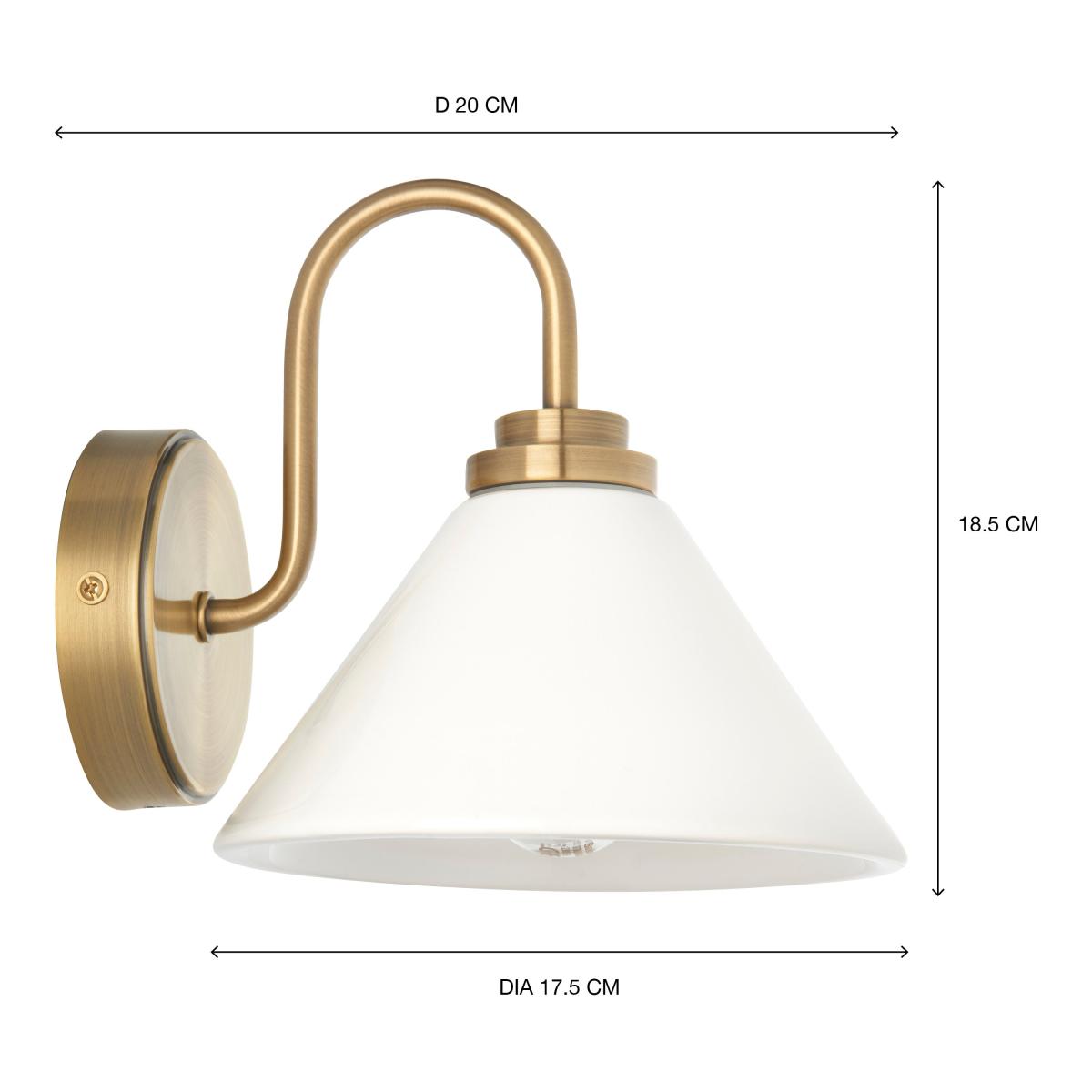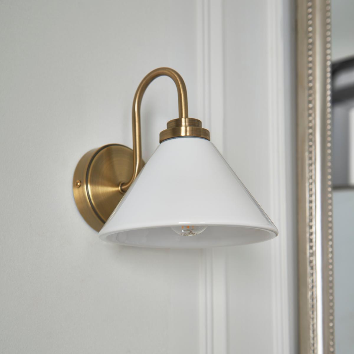 * Antique brass finish with a white shade* Suitable for bathroom use* Matching family items available to purchase separately With a timeless antique brass finish, this wall light seamlessly blends sophistication with durability. The white shade adds a touch of classic charm while providing a soft and inviting glow. Crafted specifically for bathroom use, the Keyham Wall Light combines style with functionality, creating a serene atmosphere in your space.