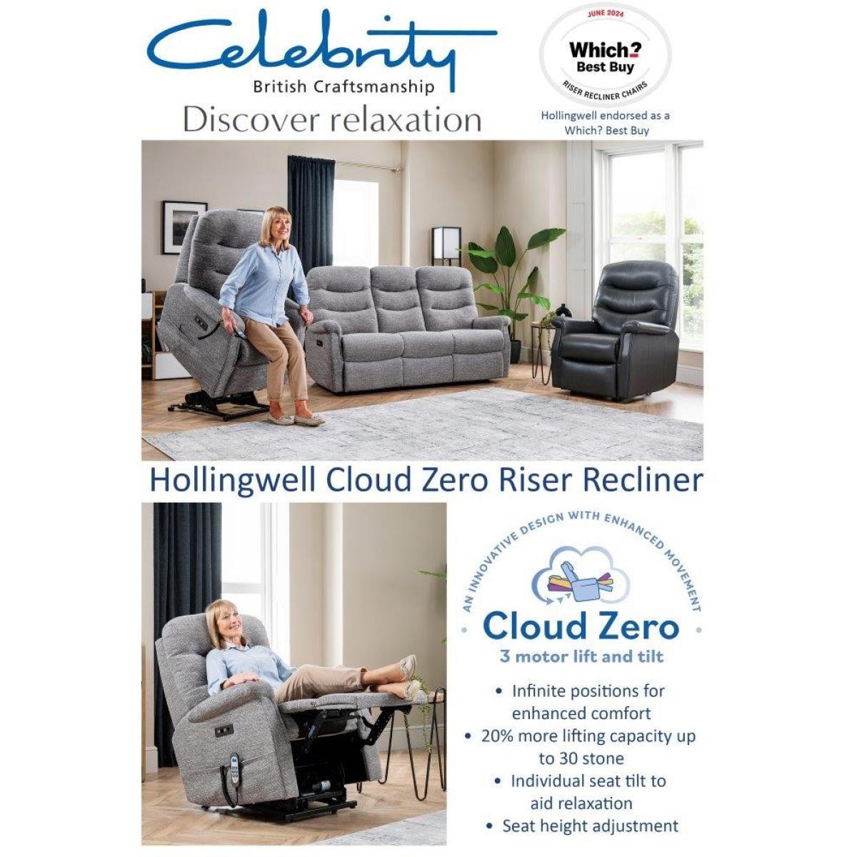 Hollingwell endorsed as a Which? Best Buy - We're pleased to advise that the Celebrity Hollingwell Cloud Zero 3 Motor Riser Recliner has recently been endorsed as a Which? Best Buy for June 2024 in the Riser Recliner Chairs category! The Celebrity Hollingwell Cloud Zero Riser Recliner Chair offers a stylish look, with a high back and softer arm detail for extra comfort. Along with the innovative powered headrest and lumbar support options for all 3 chair sizes and powered settees. All fabric models are fitted with Mammoth Medical Grade Foam seating technology and are available in any Celebrity fabric or leather. On this model there is also the option to have a powered adjustable head rest, which moved forwards and backwards to adjust head support and even an adjustable lumbar cushion as well as the Cloud Zero action which tilts the seat of the recliner when (it's in any position) to create the ulitimate personalised position for comfort. There are extra buttons for these features on the handset making it all controlable with just one hand. If Cloud Zero is added then the weight limit increases from 25 stone to 30 stone. Aquaclean® technology is a revolutionary fabric treatment that allows you to clean stains using water only. This provides you with simple fabric maintenance in the minimum amount of time. Aquaclean helps to remove all household stains (wine, ink, sauce, fat, mud, chocolate, etc.) making life easier and giving you more time for the more important things Available in any Celebrity Fabric, Aquaclean Fabric or the exclusive Salento leather. An innovative design with enhanced movement Infinite positions for enhanced comfort 20% more lifting capacity up to 30 stone Individual seat tilt to aid relaxation Aquaclean® technology is a revolutionary fabric treatment that allows you to clean stains using water only. Safe Front® reduces bacterial activity by 99.9% after 24 hour Seat height adjustment 5 Year Guarantee. Petite Cloud Zero Riser Recliner Chair Dimensions: Height: 108cm Width: 81.5cm Depth: 84.7cm Seat Height 47cm Seat Width 49cm Seat Depth 48cm Standard Cloud Zero Riser Recliner Chair Dimensions: Height: 112cm Width: 82.5cm Depth: 93cm Seat Height 51cm Seat Width 49cm Seat Depth 53cm Grande Cloud Zero Riser Recliner Chair Dimensions: Height: 117cm Width: 89cm Depth: 93cm Seat Height 53cm Seat Width 52cm Seat Depth 53cm All screens vary in colour reproduction and whilst every effort has been made to display the colour as accurately as possible it is for guidance only