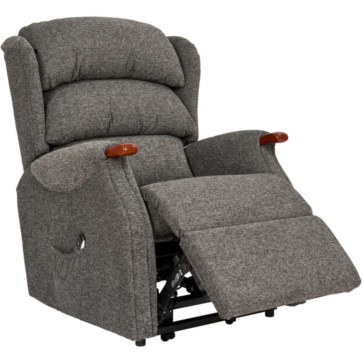 The Westbury range offers both comfort and the reassurance of solid wooden knuckle. Designed for extra comfort, the supportive triple pillow back fibre cushions are a popular choice. The solid beech wood 'grab' handle is integrated into the chair frame for more durability. All fabric models are fitted with Mammoth Grade Foam Seating Technology and all models are available in Celebrity fabric or Leather. If preferred the Westbury can be manufactured without a knuckle. Available in 3 sizes, Grande, Standard and Petite with matching fixed 2 and 3 seat settees. All Westbury fabric models come with Mammoth Medical Grade Foam Seating Technology as standard. Westbury Dual Motor Riser Recliner chairs are also available with an adjustable headrest. Celebrity has over 30 years experience creating quality upholstered furniture and are one of the UK's leading manufacturers of rising/recliner chairs. Every piece of upholstery is specifically designed for comfort and is made using the traditional skills of local craftsmen in their 108,00 square foot factory in Nottinghamshire. All Celebrity furniture comes with a 5 year guarantee. Grande: Chair Dimensions Height 117cm Width 84cm Depth 94cm. Seat Dimensions Height 53.5cm Width 52.5cm Depth 52cm. Standard:Chair Dimensions Height 109cm Width 77.5cm Depth 89cm Seat Dimensions Height 49cm Width 48.5cm Depth 50cm Petite: Chair Dimensions Height 104cm Width 725cm Depth 86.5cm Seat Dimensions Height 47cm Width 45cm Depth 45.5cm