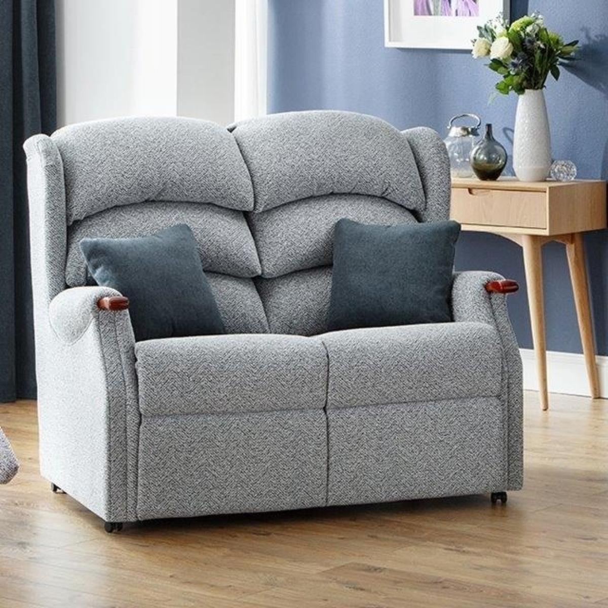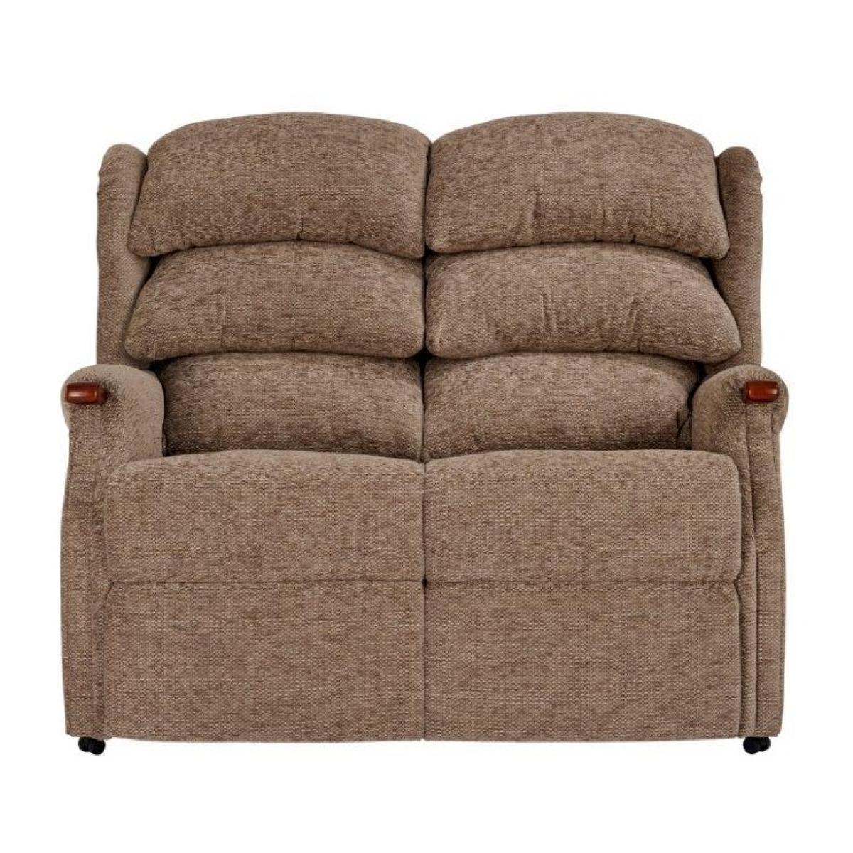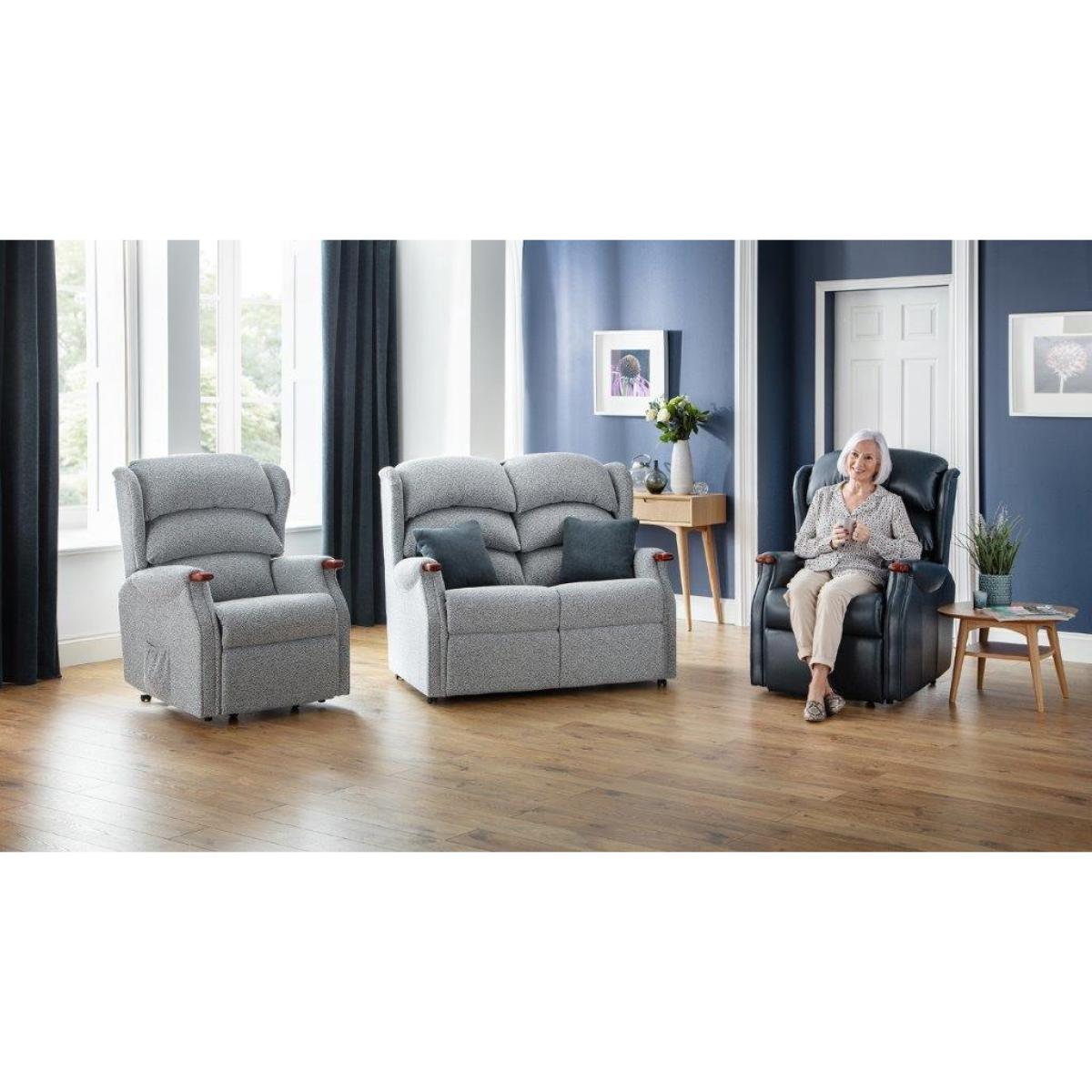 The Westbury range offers both comfort and the reassurance of our solid wooden knuckle design. Designed for extra comfort, the triple pillow back fibre cushions are a popular choice. The solid beech wood 'grab' handle is integrated into the chair frame for more durability. All fabric models are fitted with Mammoth Medical Grade Foam Seating Technology and all models are available in any Celebrity fabric or Leather. Celebrity have over 30 years experience quality upholstered furniture and are one of the UK's leading manufacturers of rising/reclining chairs. Every piece of upholstery is specifically designed for comfort and is made using the traditional skills of local craftsmen in Celebrity's factory in Nottinghamshire. All Celebrity furniture comes with a 5 year peace of mind guarantee. With a choice of real wood grab handles or if preferred the Westbury is available without a knuckle there are plenty of options to customise your Westbury sofa. 2 Seater Dimensions: Height - 110cm Width - 128cm Depth - 86cm. Seat Height - 49cm Seat Width - 99cm Seat Depth - 50cm. All dimensions are approximate. Allow a minimum tolerance of 13mm on each dimension quoted and dimensions will alter slightly after use. Every piece of timber used is a unique material designed and produced by nature itself. Therefore, cannot guarantee an exact match between pieces. All screens vary in colour reproduction and whilst every effort has been made to display the colour as accurately as possible it is for guidance only.