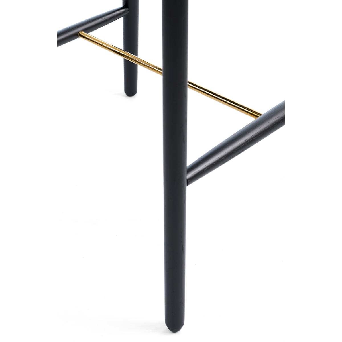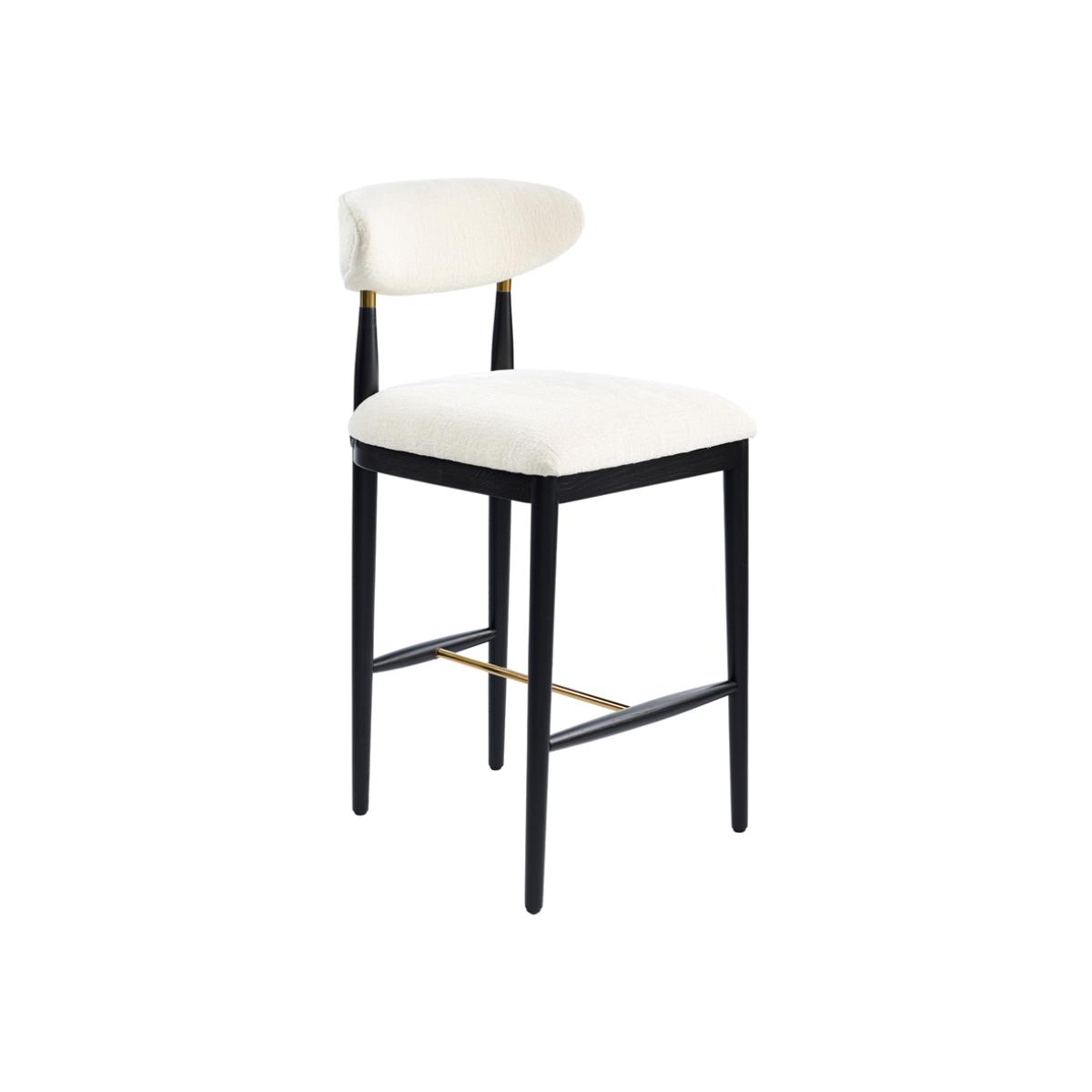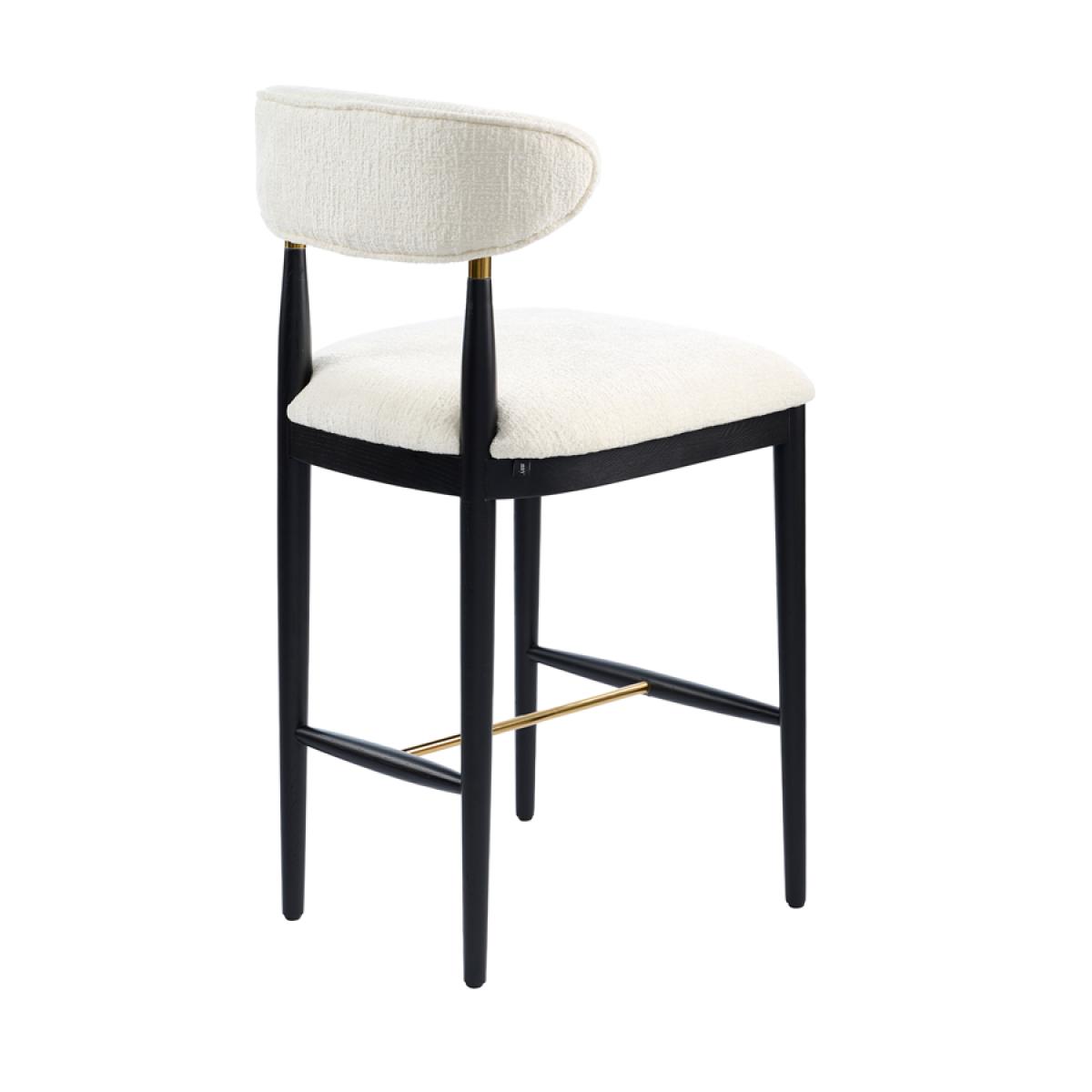 Elegant counter stool for breakfast bars and kitchen islands. Curved backrest provides excellent comfort and support. Plush chenille upholstery with a soft, inviting texture. Sprung slatted base for superior comfort and support. Solid black stained ash wood frame. Steel accents with polished brass electroplated finish. Perfect for adding a touch of understated elegance to kitchen areas. Supplied fully assembled.