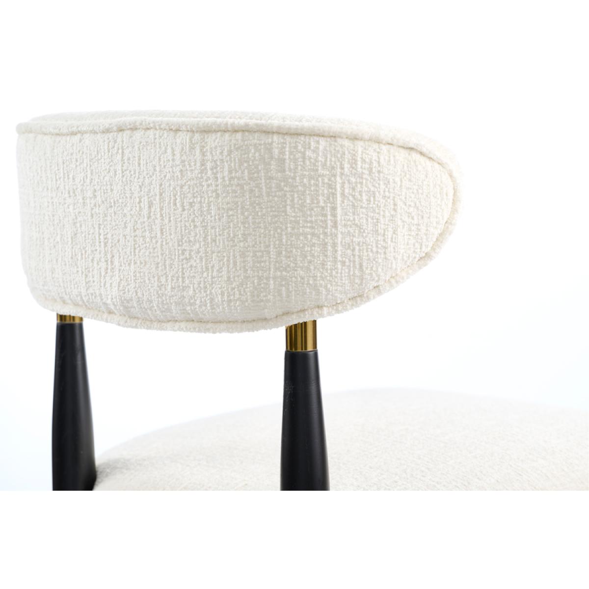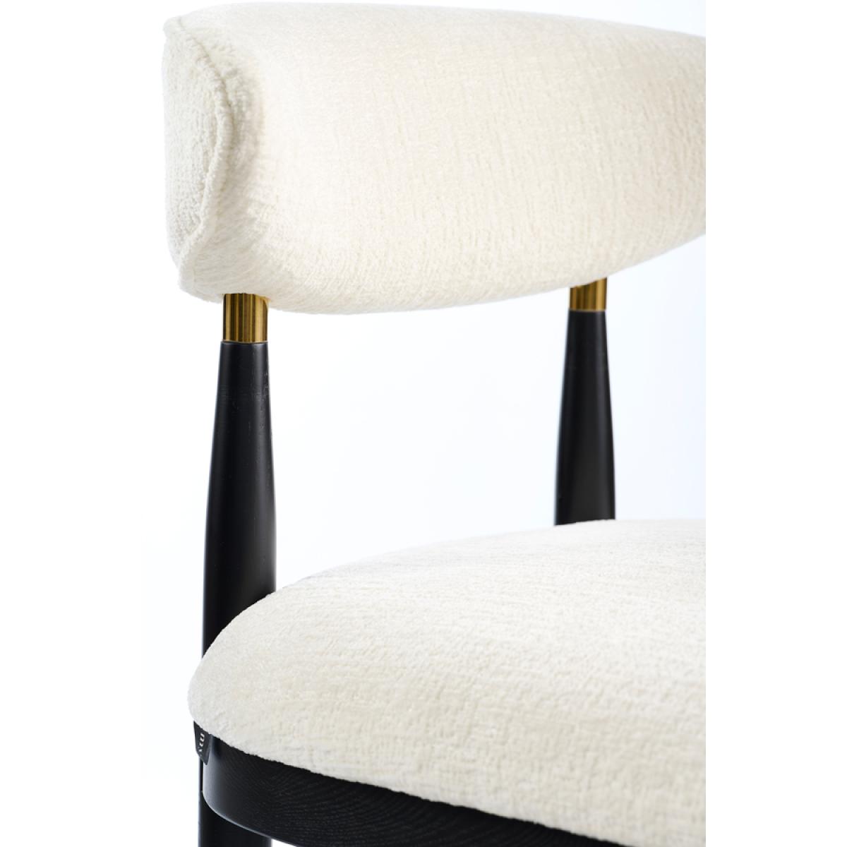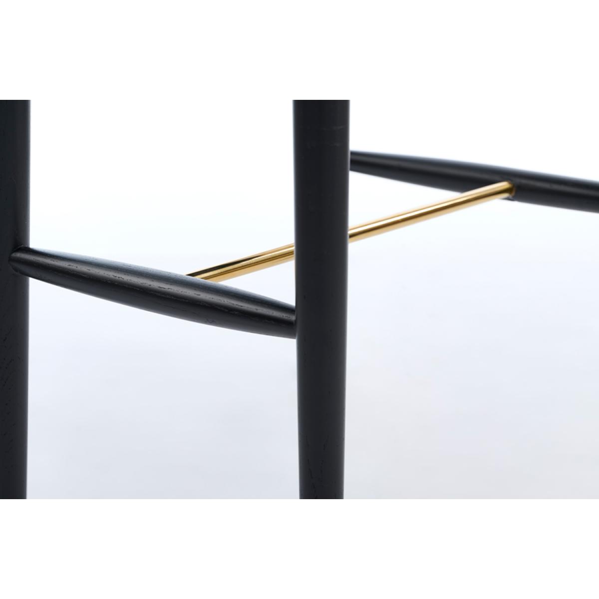 Elegant counter stool for breakfast bars and kitchen islands. Curved backrest provides excellent comfort and support. Plush chenille upholstery with a soft, inviting texture. Sprung slatted base for superior comfort and support. Solid black stained ash wood frame. Steel accents with polished brass electroplated finish. Perfect for adding a touch of understated elegance to kitchen areas. Supplied fully assembled.