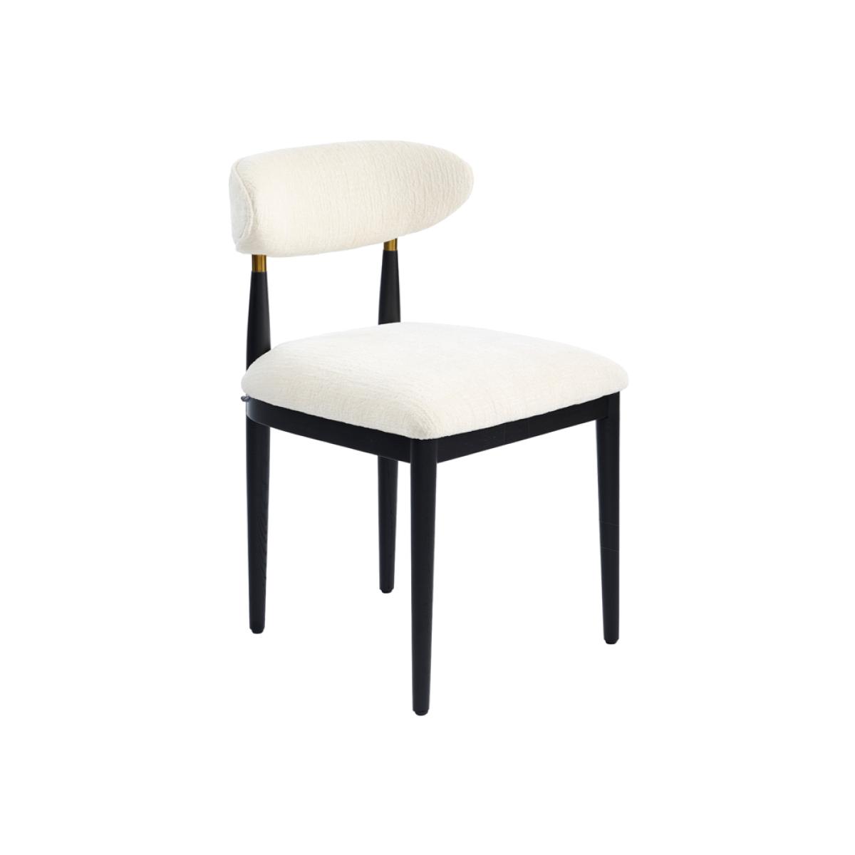 Sleek, contemporary dining chair with an elegant, curved backrest. Plush chenille upholstery with a soft, inviting texture. Sprung slatted base for superior comfort and support. Solid black stained ash wood frame. Steel accents with polished brass electroplated finish. Perfect for adding a touch of understated elegance to dining spaces. Supplied fully assembled.