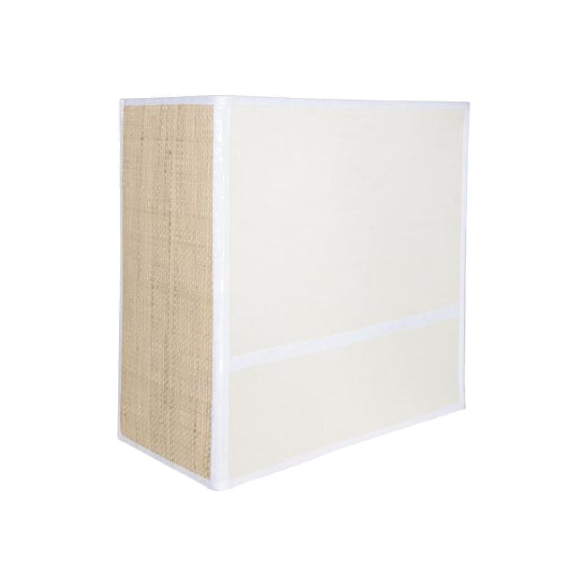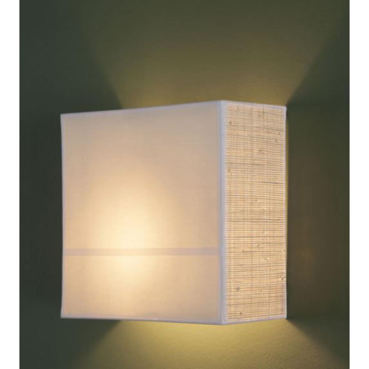 Geometric composition. Covered with cotton and natural raffia, the Céleste wall lamp mixes colours and materials in a very graphic geometric composition. The refined linear design is reminiscent of the lines of Japanese architecture. A soft, delicate light is diffused through the natural materials. The structure is open at the top and bottom, diffusing both direct and indirect lighting. PLEASE NOTE: Non-electrified wall light. The price includes only the lampshade to fix on the wall: the electrical system and socket are not supplied (can be purchased separately from a DIY store).