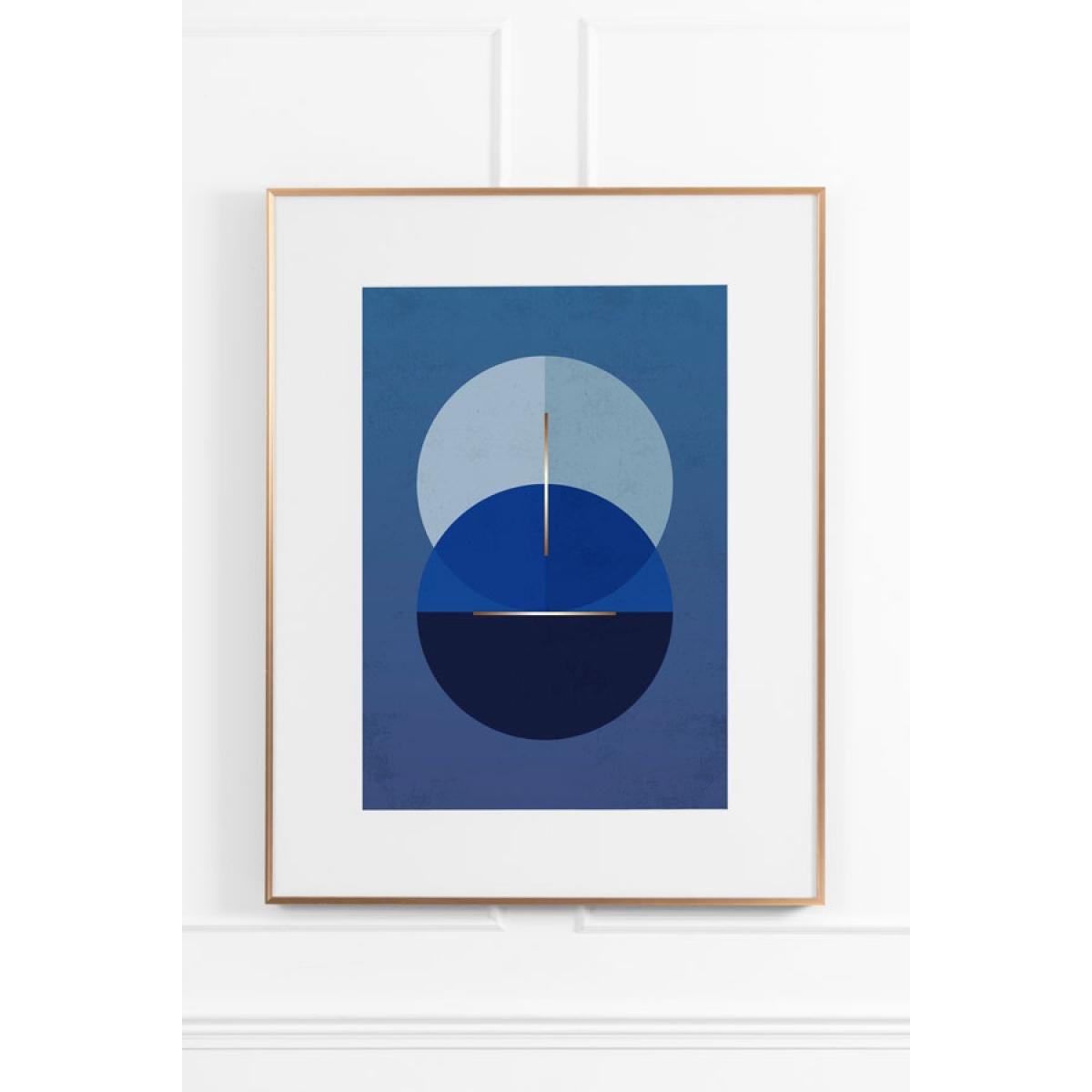 A bold geometric print featuring overlapping circles in tones of blue, hand finished with gold metallic ink. 250gsm paper with a satin finish complete with an elegant aluminium frame in a brass finish.