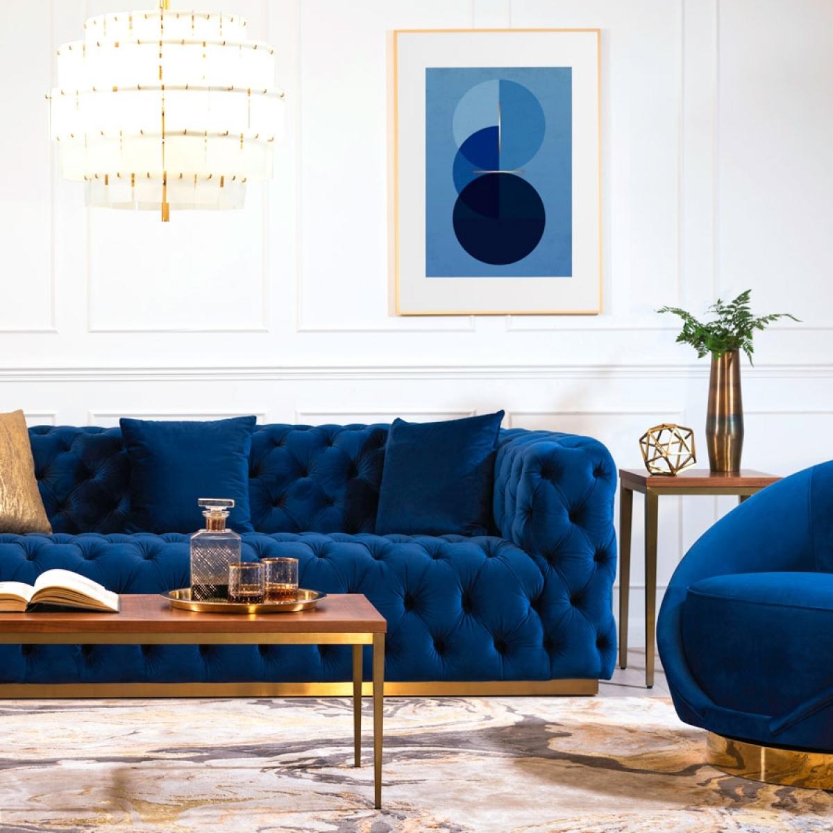I love this piece because of its clean, contemporary look combined with that rich blue hue - it’s a versatile artwork that works well in both modern and traditional interiors. The brass frame adds a touch of warmth and sophistication, making it suitable for spaces like living rooms, hallways, or bedrooms aiming for a stylish yet understated statement. When styling, consider pairing it with other brass accents or neutral tones to keep the focus on the artwork. For a balanced look, hang it at eye level and keep surrounding decor minimal to allow the deep blues and geometric design to truly stand out. It’s a great option for adding colour and visual interest without overwhelming the space.