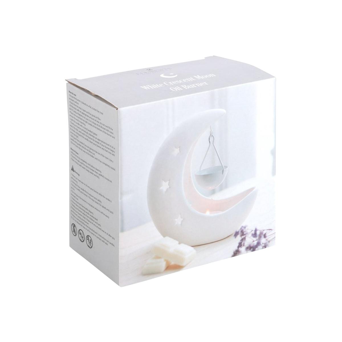 This enchanting white crescent moon oil burner has been designed to enhance the home with a dreamy, magical midnight atmosphere. Fill the hanging bowl with fragrance oil in a mystical scent and watch as the cut out star details cast a celestial glow, adding an ethereal touch to your space. CAUTION bowl will be hot whilst in use. Recommended for use with fragrance oil diluted with water. Allow to cool completely before handling.