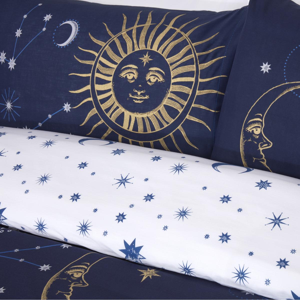 Stunning celestial duvet set featuring an ethereal design of metallic suns and moons on a rich dark background. This design is also fully reversible with an angelic, contrasting ditsy star reverse.