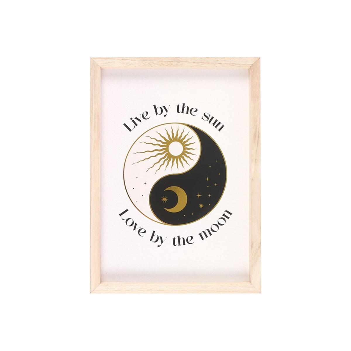 This framed print features a celestial yin and yang symbol and inspirational "Live by the sun, love by the moon" text, used to represent the harmony of opposites. Display in a bedroom, living room or office space as a gentle reminder to remain true to yourself and maintain spiritual balance. Sawtooth hanger on reverse.
