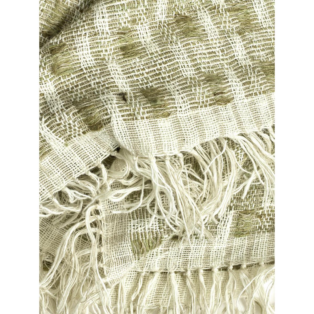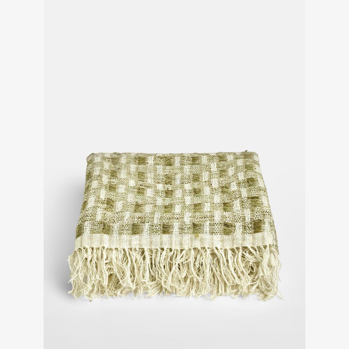 A blend of silk and linen fibres have been hand-woven by skilled artisans in India to make our Celio throw. Green threads blend with natural tones in a geometric design, with the hand dyeing techniques used creating distinctive colour variations and unique characteristics that make each throw a true one off. • Hand-woven silk and linen throw • Block pattern in green and cream • Hand dyeing technique creates unique variations in colour • Made in India • Designed for the forthcoming Soho House Rome