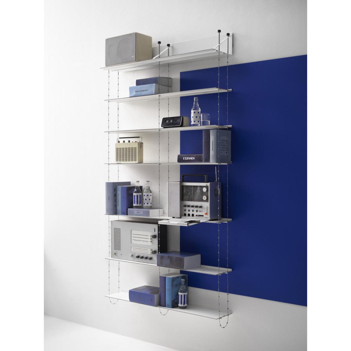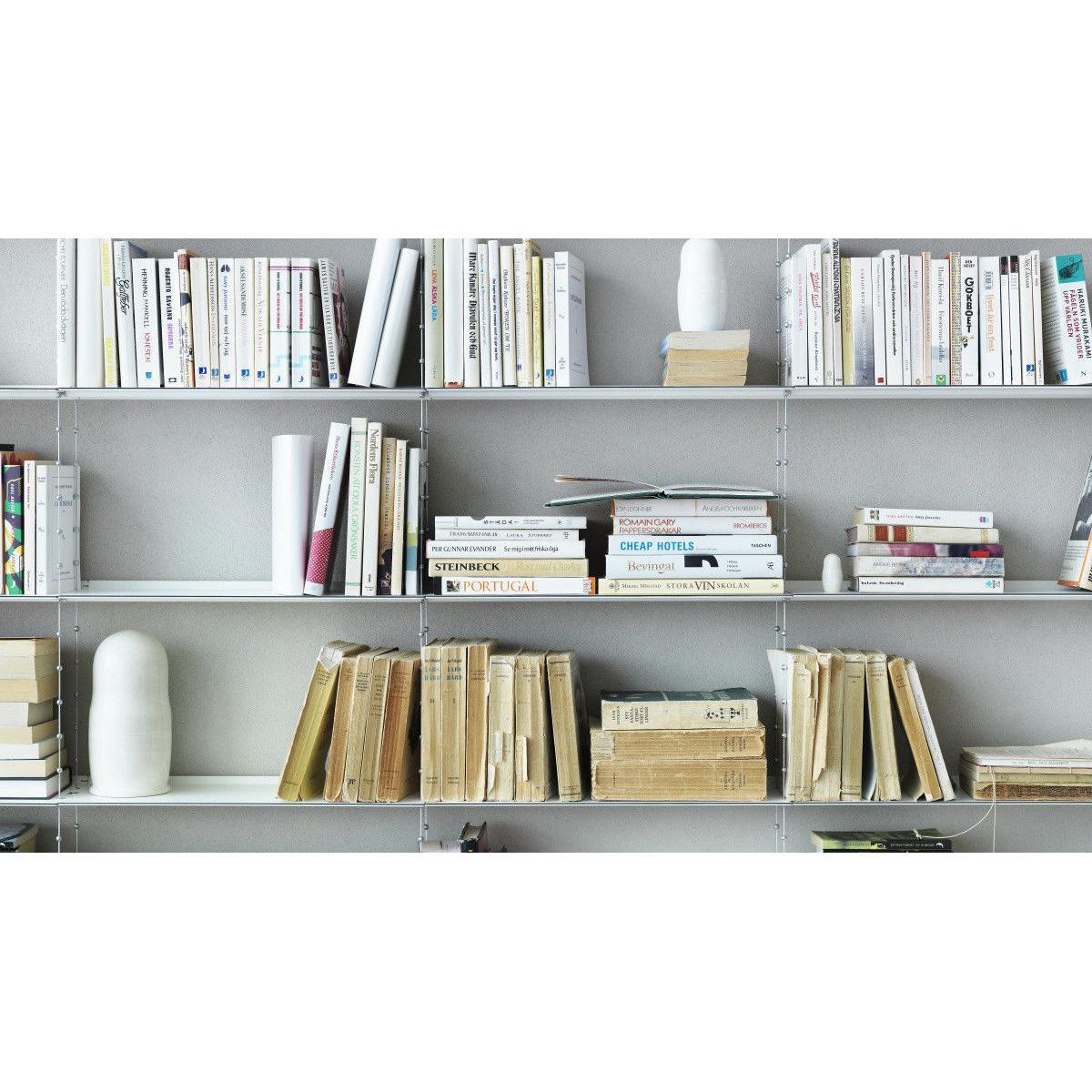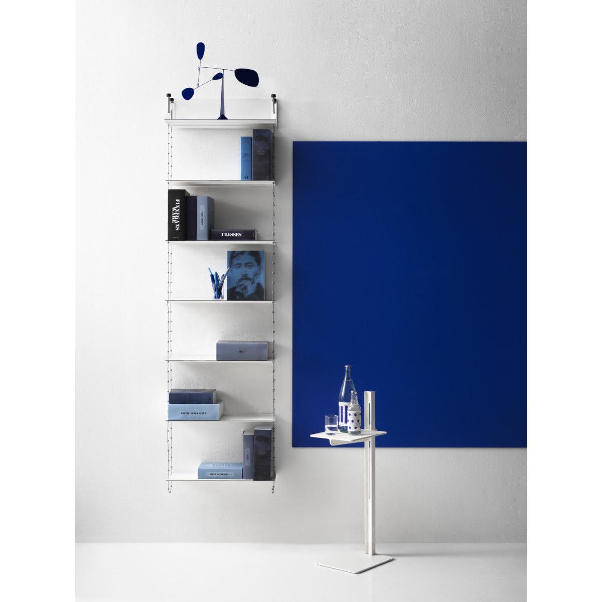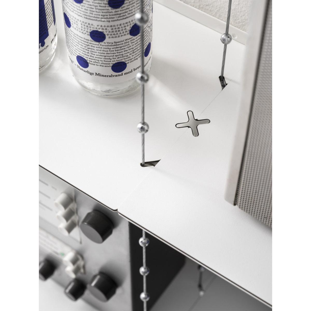 "Creating a floating illusion, the Cell shelving stands out with its breathtaking, ethereal design: this is a stunning architectural element which will enhance walls in a both discreet and original way. It is composed of 7 shelves (L 52 cm) suspended using steel cables. Extendible, adjustable, and extremely sturdy, the Cell shelving has been designed to last over the years and to adapt to your needs. Its unique and exclusive design is the product of leading-edge technology, with the aim of ultimate simplicity. The cables can be adjusted to a millimetre exact, thanks to the wheel on the top shelf. The height of each shelf can be adjusted easily thanks to the zinc bearings soldered onto the cable. Once the height has been adjusted to your taste, a magnetic holder system fixed into the wall will stabilise and rigidify the structure. Laterally, the Cell A shelving can be extended as you like, through the addition of extra B modules, to the right of the A module. Always begin your composition with an A module, then add the desired number of B modules to the right of the module. Designed by Peter Cohen in 2005, the Cell shelving straight away claimed several design accolades in Sweden. It is exhibited in the National Museum, in Stockholm. Continuing in the line of the famous "Less is more" by Miles van der Rohe, the Cell shelving embodies the designer's aspiration to use the most advanced technology to achieve ultimate simplicity. Peter Cohen is a multi-disciplinary creator (writer, film-maker, film producer, documentary director, furniture designer) with a degree from the University of Stockholm. He explains: "I designed this shelving for someone with a lot of books. I needed to be extremely efficient in terms of space, but also aesthetically, in terms of sturdiness, and in terms of creating a lightweight design. The idea formed slowly, whilst I slept. I imagined a bridge with cables and pylons. I also visualised the form of a double helix, the shape of DNA, with its long and fine strands. " Peter Cohen got to work on a prototype, based on a pair of metal cables with ball-shaped brackets at regular intervals. "I had to search far and wide for someone who could produce them. I discovered that there were only two large industrial names who could, one of them being Swedish. Unfortunately, they showed no interest in my project. " Yet, fortunately, they eventually changed their minds. Together, engineers and the designer developed the cable which Cohen had visualised. The shelves were also the subject of creative reflection and intelligent construction. "I wanted shelves that were sturdy yet extremely lightweight. Finesse played an essential role for the appearance, and I needed shelves that could support a heavy weight without bending. ". To achieve this, the shelves were made using highly-resistant steel. It is the same steel that is used to make cars crash-resistant. The thin shelf has a black edging to make the edges visible, in the form of fine lines, cutting through the air across the light, white and ethereal composition. In 2021, String released the Cell shelving, after a hiatus of several years. Technically and visually perfected, it isn't just robustly constructed, but is also manufactured in a unique way. Perhaps String may pay tribute to Cohen's history on this level: when you've spent more than half of your living making films, you understand the importance and value of the details, and you never give up, no matter how many years it takes to make sure something is done properly.