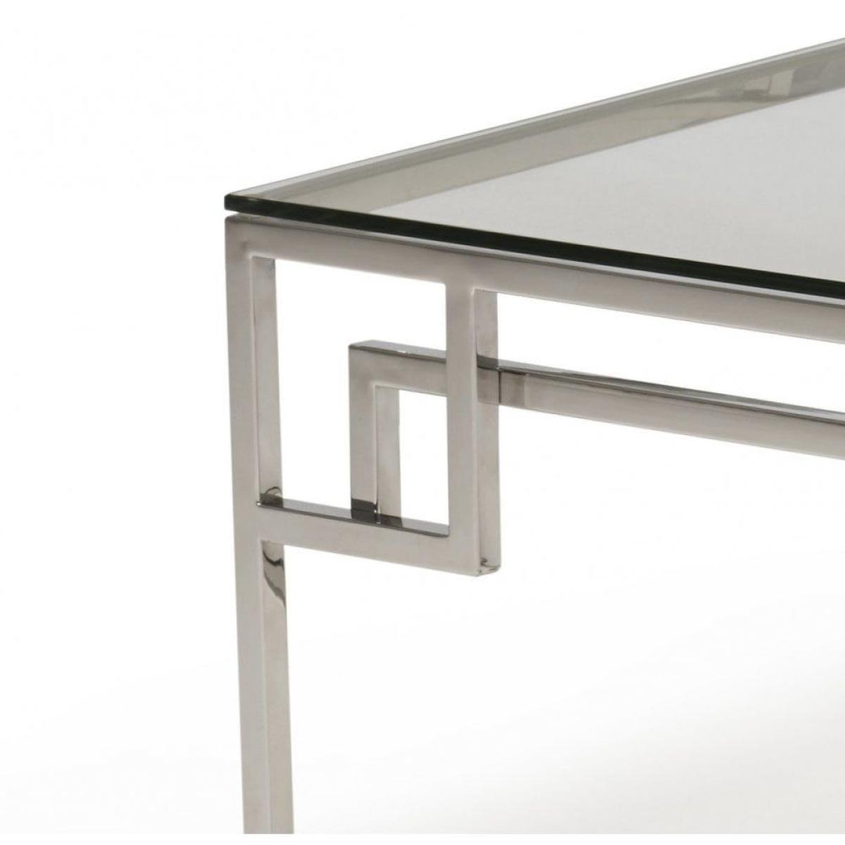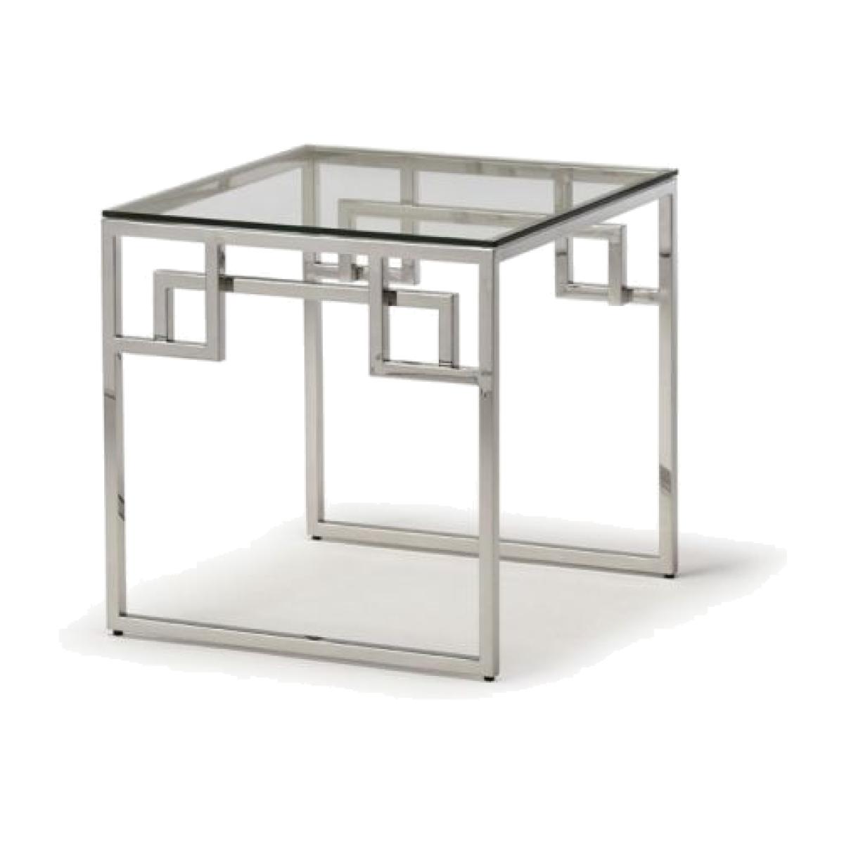 Featuring a clear toughened glass top with an ornate Polished stainless steel frame, this lamp table is part of Kesterport luxury occasional collection.