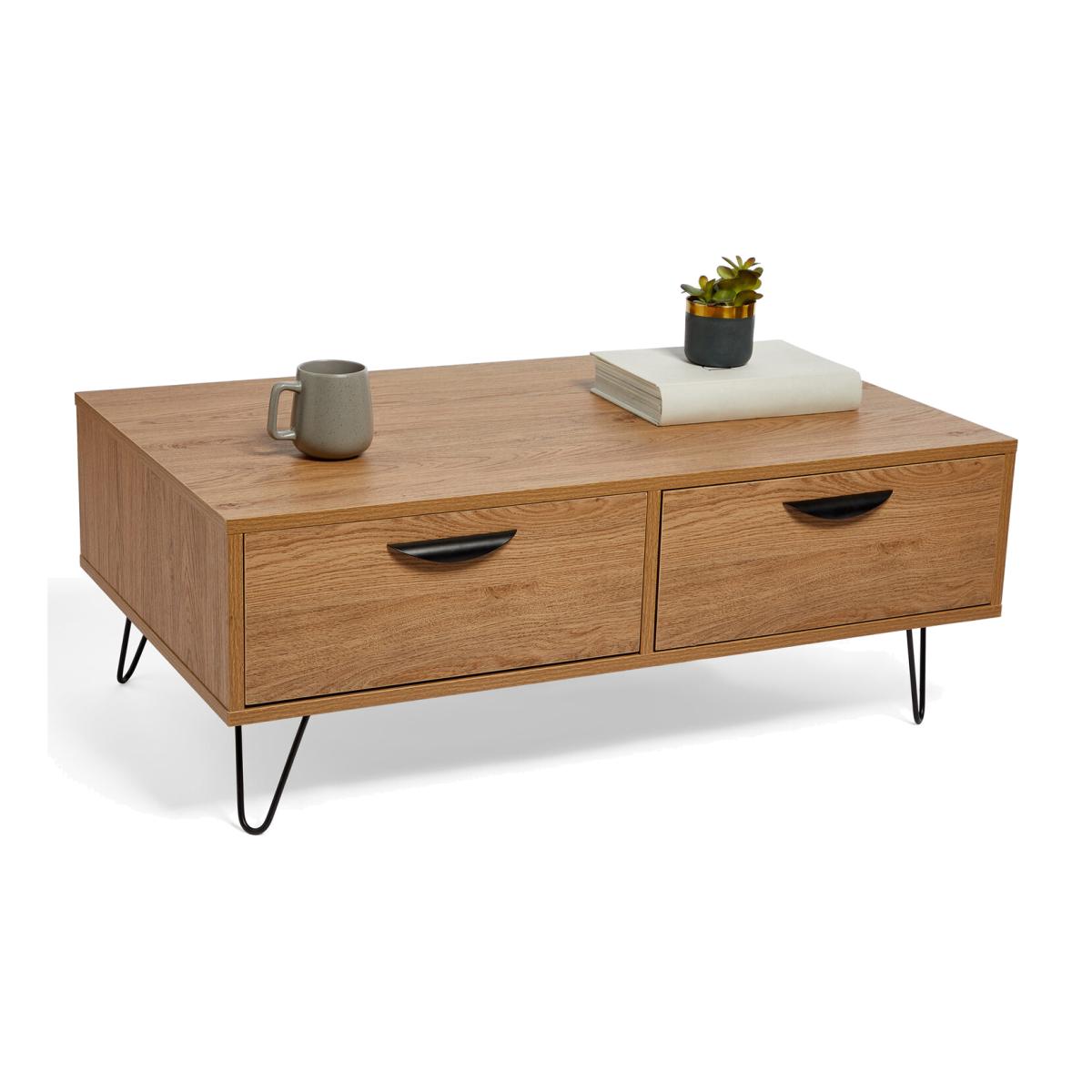 With a compact shape and large top surface, bring natural yet industrial style into your space and refresh your living room. Black metal hairpin legs offer sturdy, reliable support and an eye-catchingly modern design. Use the two spacious pull-out drawers to organise your living room and tidy away remotes, magazines and more. With an easy assembly process, have the table set up in minutes thanks to easy-to-follow instructions. Shop the Capri range for more natural-industrial style, with a Large TV Unit, Sideboard, Shelving Unit, Desk, and Compact TV Unit.
