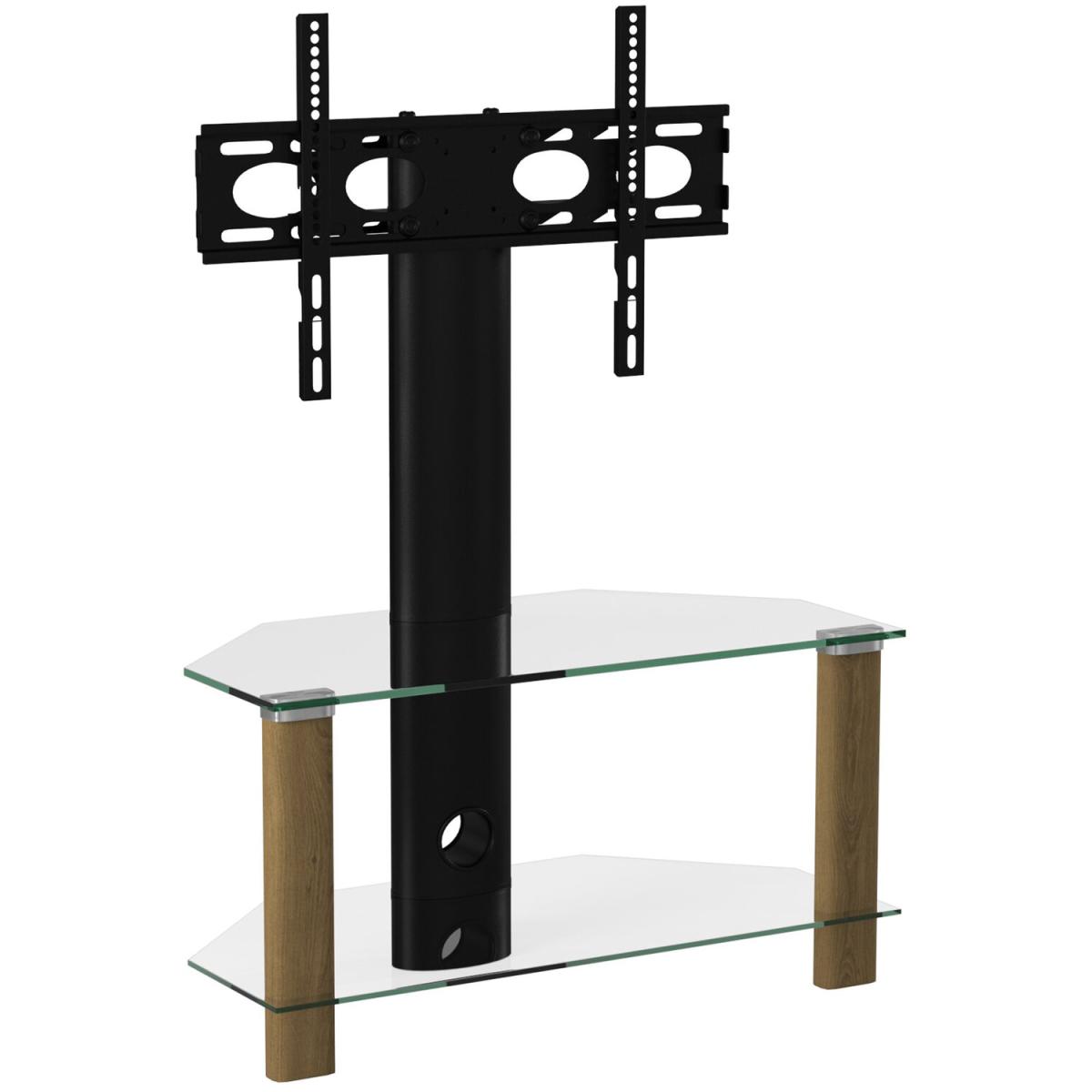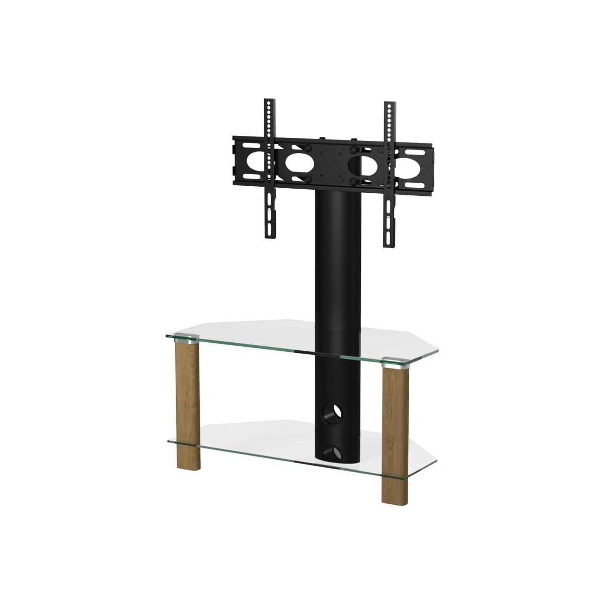 With its simplistic, open design the Century 800 Corner TV stand is both attractive and functional. It features 2 toughened glass shelves and central cable management for maintaining a tidy look.