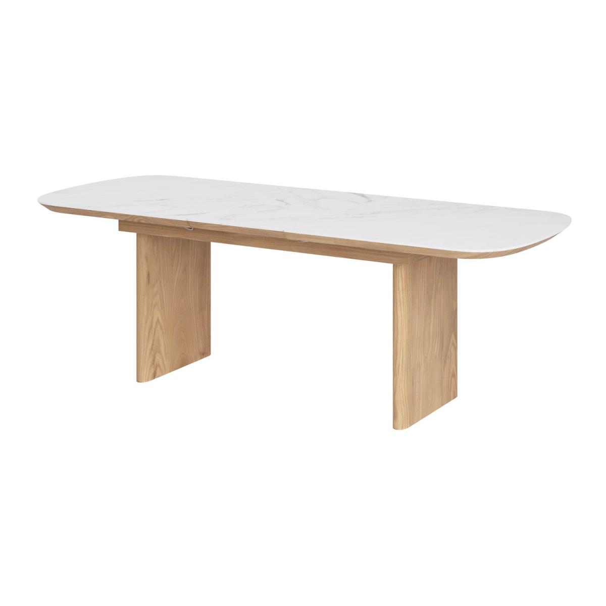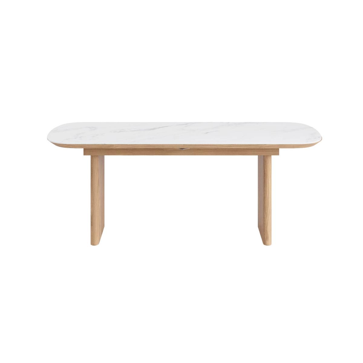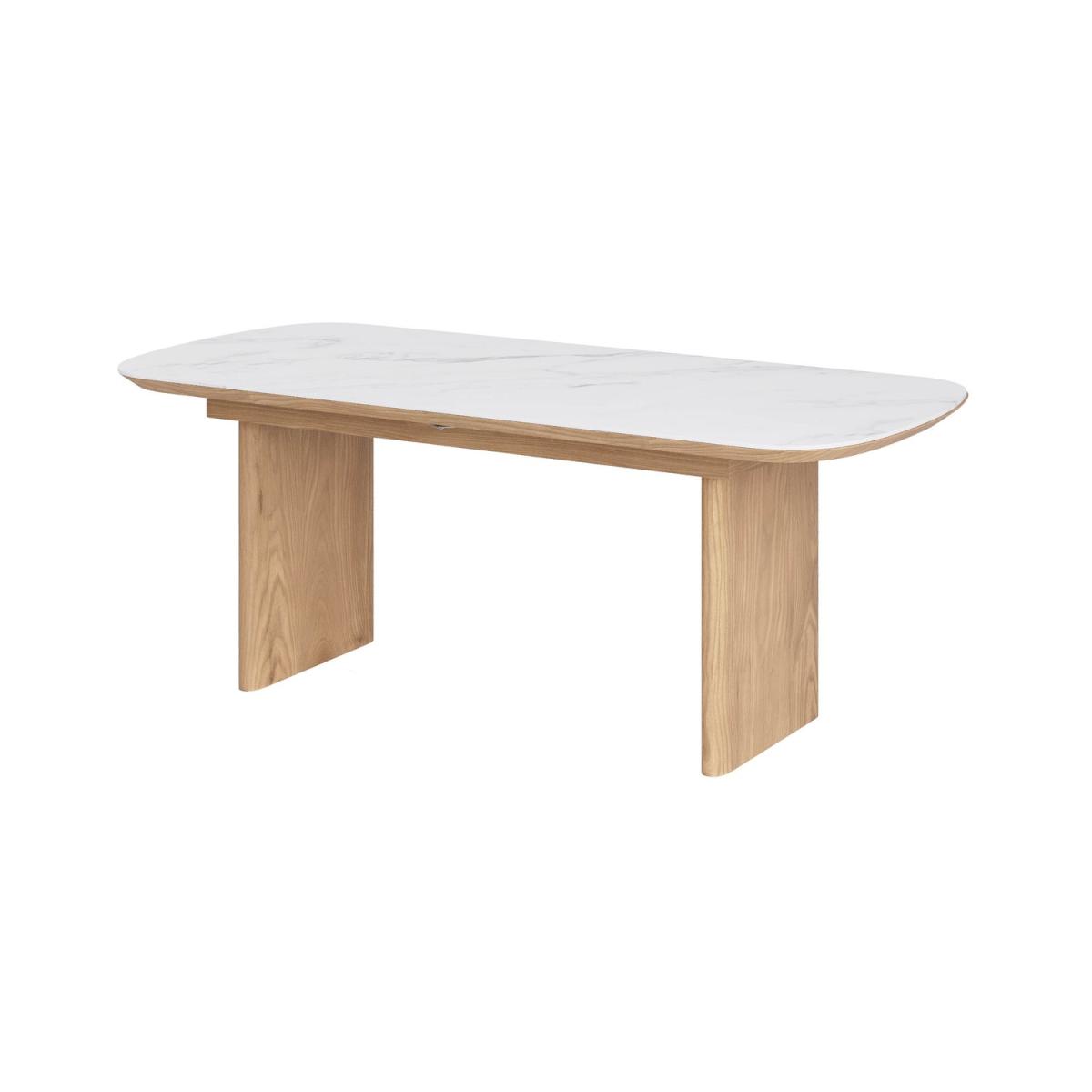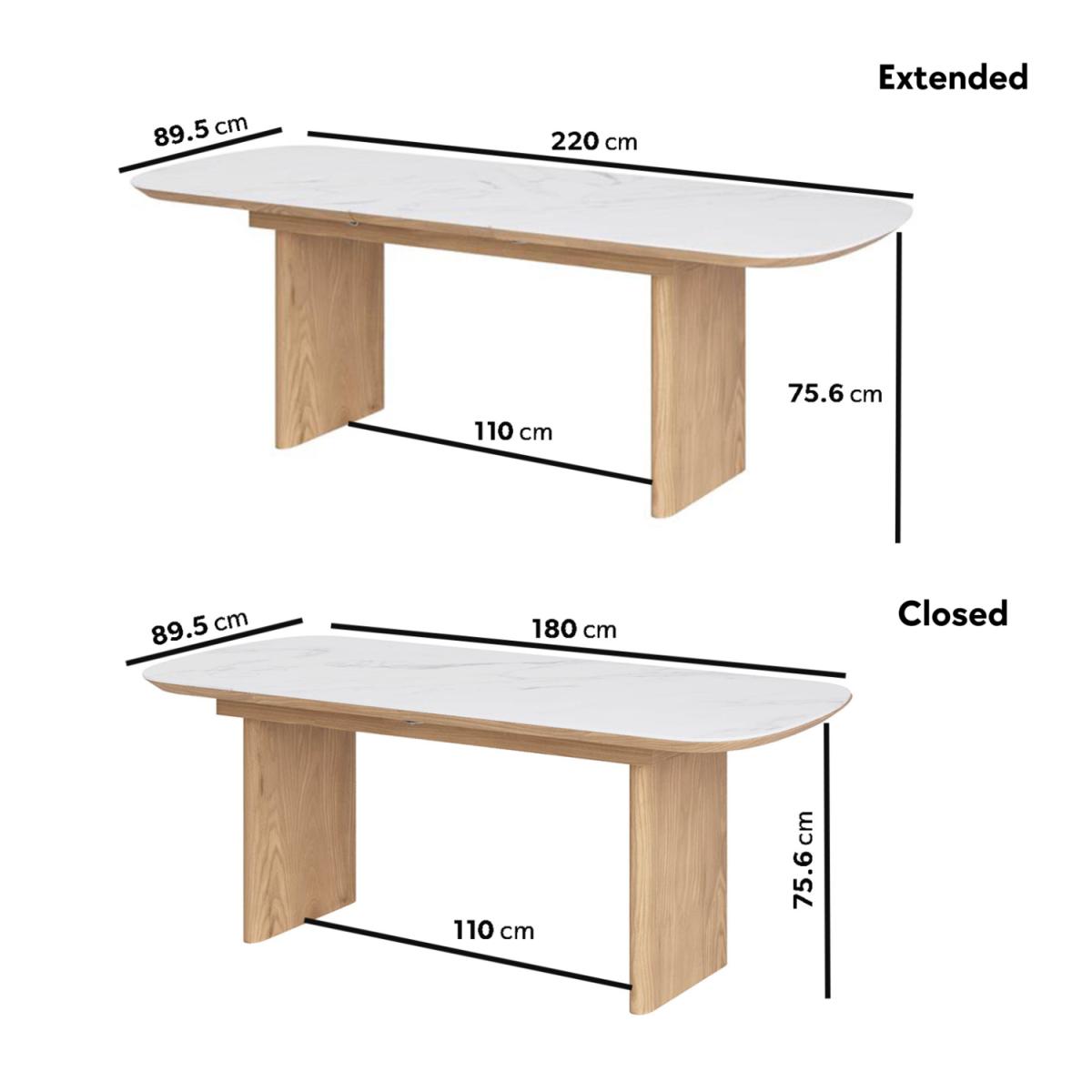 The table’s smooth extension mechanism allows you to expand to accommodate more guests with ease, comfortably seating six to eight guests for everyday meals or special occasions. Heat and scratch-resistant, the ceramic surface offers a luxury look with practical benefits, showcasing unique veining for a one-of-a-kind finish. The warm oak base adds warmth and timeless style, bringing texture and strength to your dining space. This fully upholstered dining chair brings refined style and understated elegance to your space, with its soft beige real leather finish and sculptural curved silhouette. Designed to impress from every angle, it's a perfect fit for contemporary, luxe, or minimalist interiors. The gently curved backrest offers ergonomic support, while the foam-filled seat ensures lasting comfort, whether you're enjoying a quick breakfast or gatherings. Whether styled in a modern dining room or a classic dining room, this set delivers elegance, comfort, and function. Upgrade your dining space with the Marian Extendable Dining Table and Josie Dining Chairs Set, a perfect balance of modern elegance and timeless craftsmanship. Designed for both intimate meals and larger gatherings, the Marian dining table features an extendable oak frame paired with a luxurious marble ceramic top that is heat and scratch-resistant, ensuring durability without compromising on style. With its sleek, contemporary aesthetic, this table comfortably accommodates 6 guests, making it a versatile centrepiece for any dining room. Crafted for those who appreciate timeless materials and high-end details, the Josie beige leather dining chairs bring effortless sophistication to any setting. The curved back and armrests offer superior comfort and support while dining and together with the Marian dining table, this set brings lasting sophistication and elevated practicality to modern dining spaces. Please use heat-protective mats & coasters when placing items onto the table to protect the tabletop, clean up any spills straight away as wood is porous and will absorb liquids. Due to the natural characteristics of the wood and ceramic, each table is unique and may vary to images shown on site.